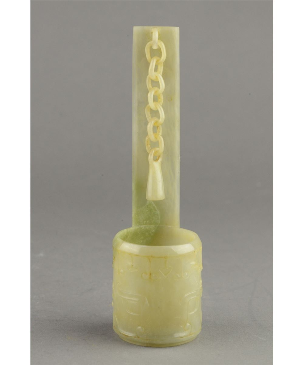 Finely rendered Chinese jadeite carved water bucket with chain; bucket decorated with Chilong and motifs in low relief; the stone of celadon tone; H: 16 cm, D: 5 cm, 110 grams