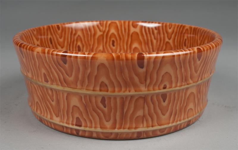 Of bucket form, finely painted to depict bamboo with two raised rings in gilt to simulate iron bands, the recessed base with seal mark for the Great Qing Qianlong Production in gilt. 3.25" H x 9" Dia., circa late 19th/early 20th century. A very unusual bowl.
