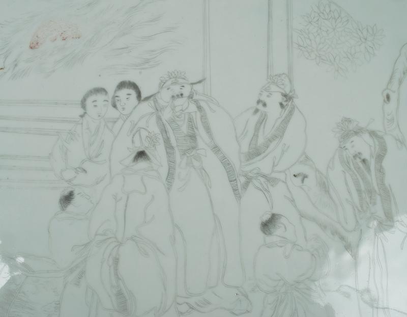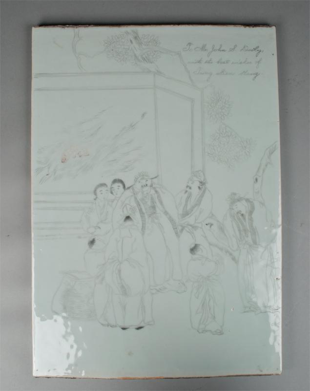 Incised decorated under the glaze, to depict figures around the emperor, with inscription as being given to Mr. John S Dooly with the best wishes of Tung Sien Kang, with an additional signature on back signed 16.5"H x 11.75"W