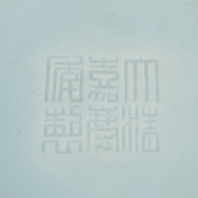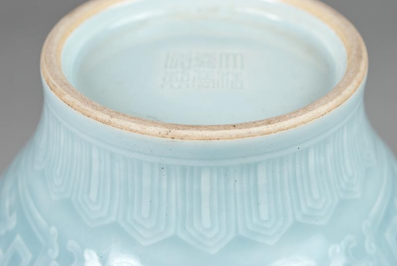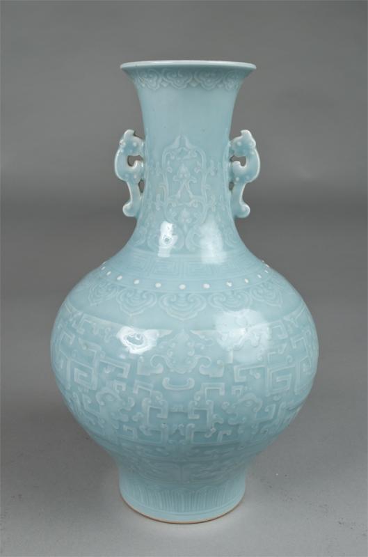 Finely molded to depict archaic symbols with two dragon handles, the base with carved seal mark for the Great Qing Qianlong Production. 11.25" H, circa early 20th century.