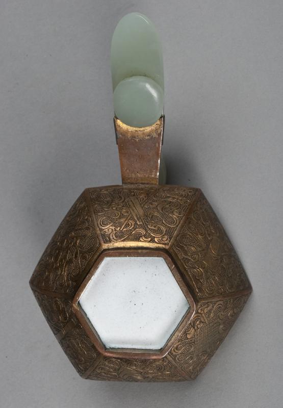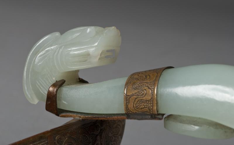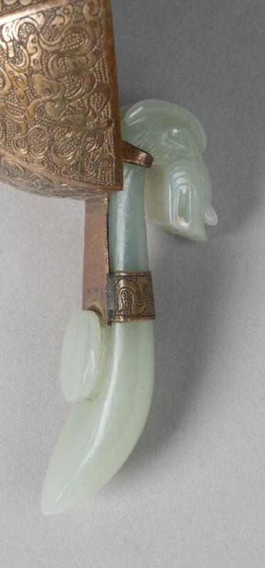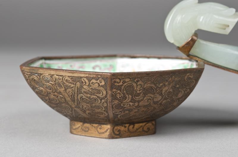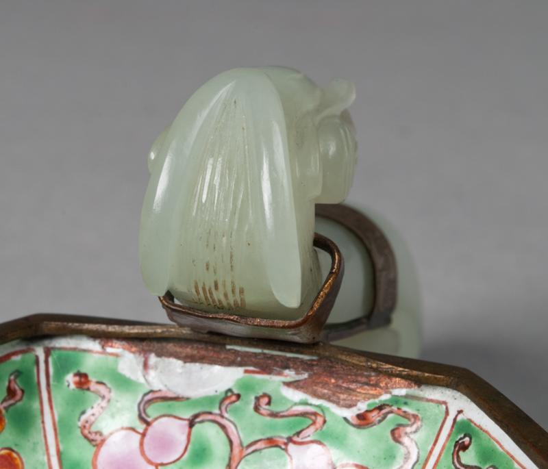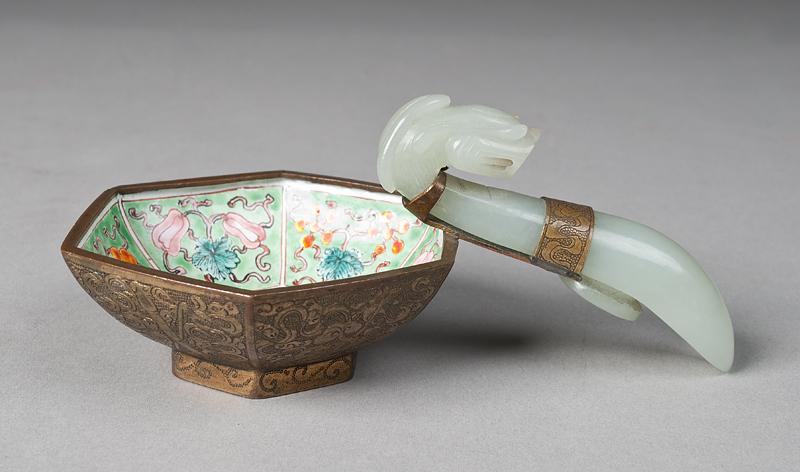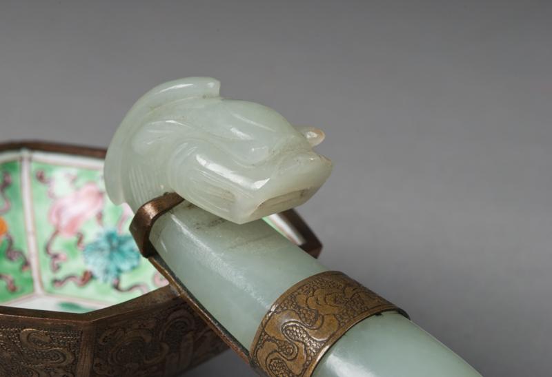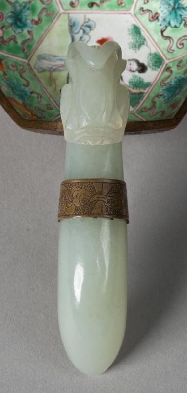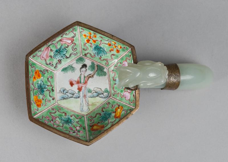 The cup finely enameled to depict a lady within a landscape, the sides with six scenes of various floral and fruit decoration, the exterior of the basin finely molded to depict antiques surrounded by ruyi, the handle finely carved in celadon jade in the shape of a dragon garment hook, the stone a medium celadon with a very fine polish, and very well carved, 5.25"L x 2.25"H, circa 19th century.