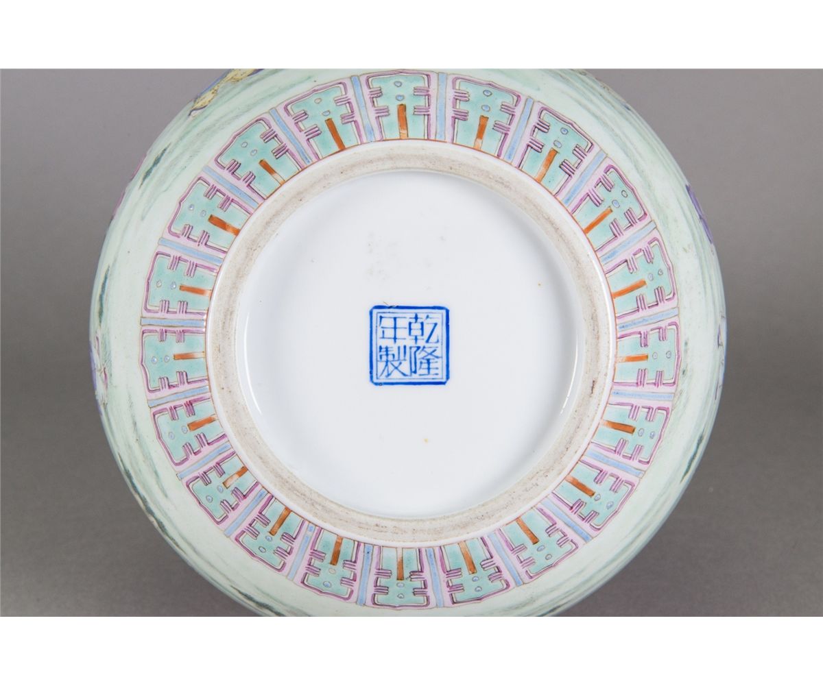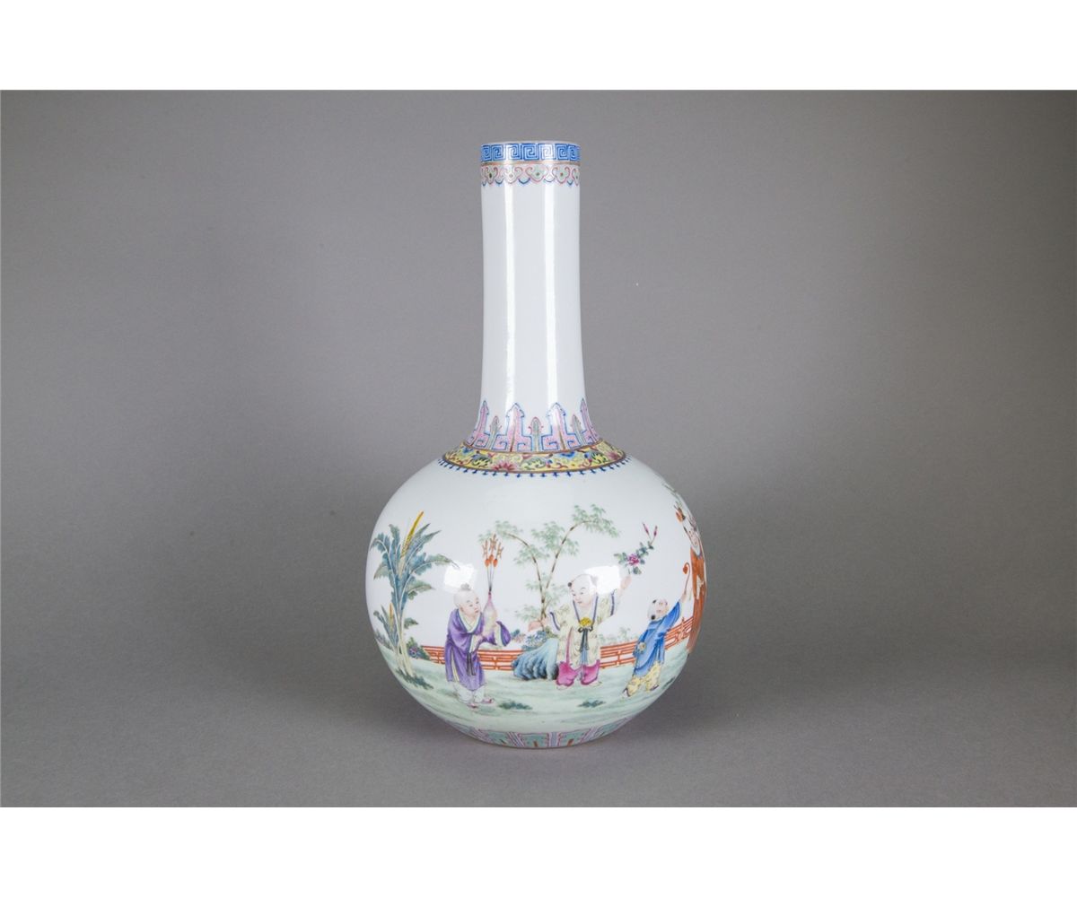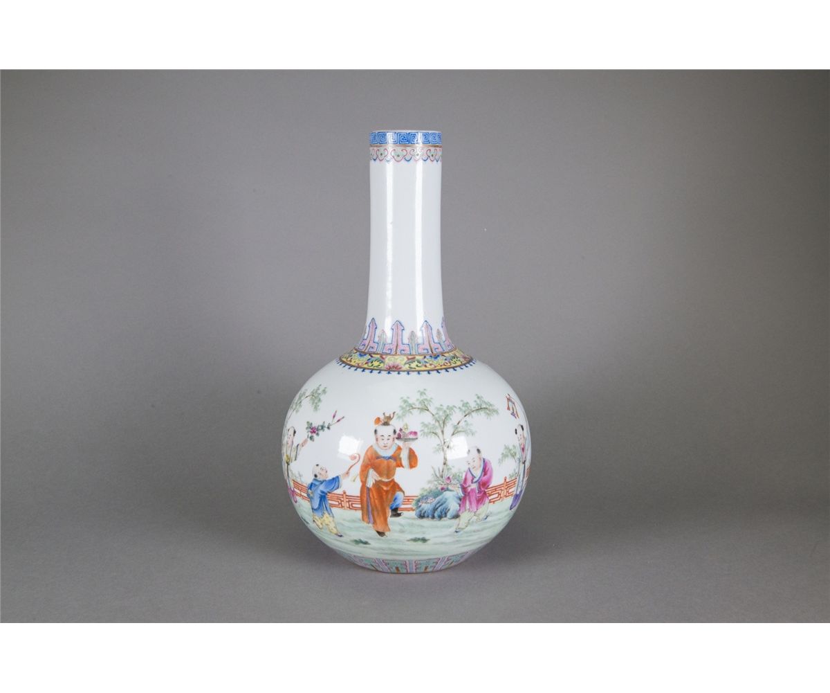 Fine Chinese Famille Rose porcelain vase; featuring a globular body with long neck; featuring children playing scene; four-character Qianlong mark on base; Qing period; H: 34 cm, D: 20 cm, 1600 grams