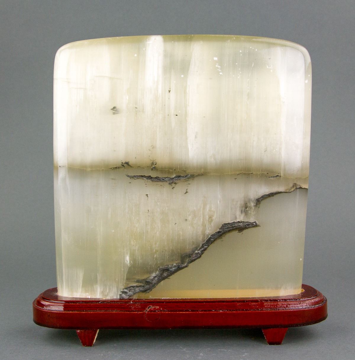 Quartz Crystal rock boulder; of flatten square section; the stone of translucent white tone with black stripes; custom-made wood stand included; H: 23 cm, W: 5 cm, L: 23 cm, 2664 grams