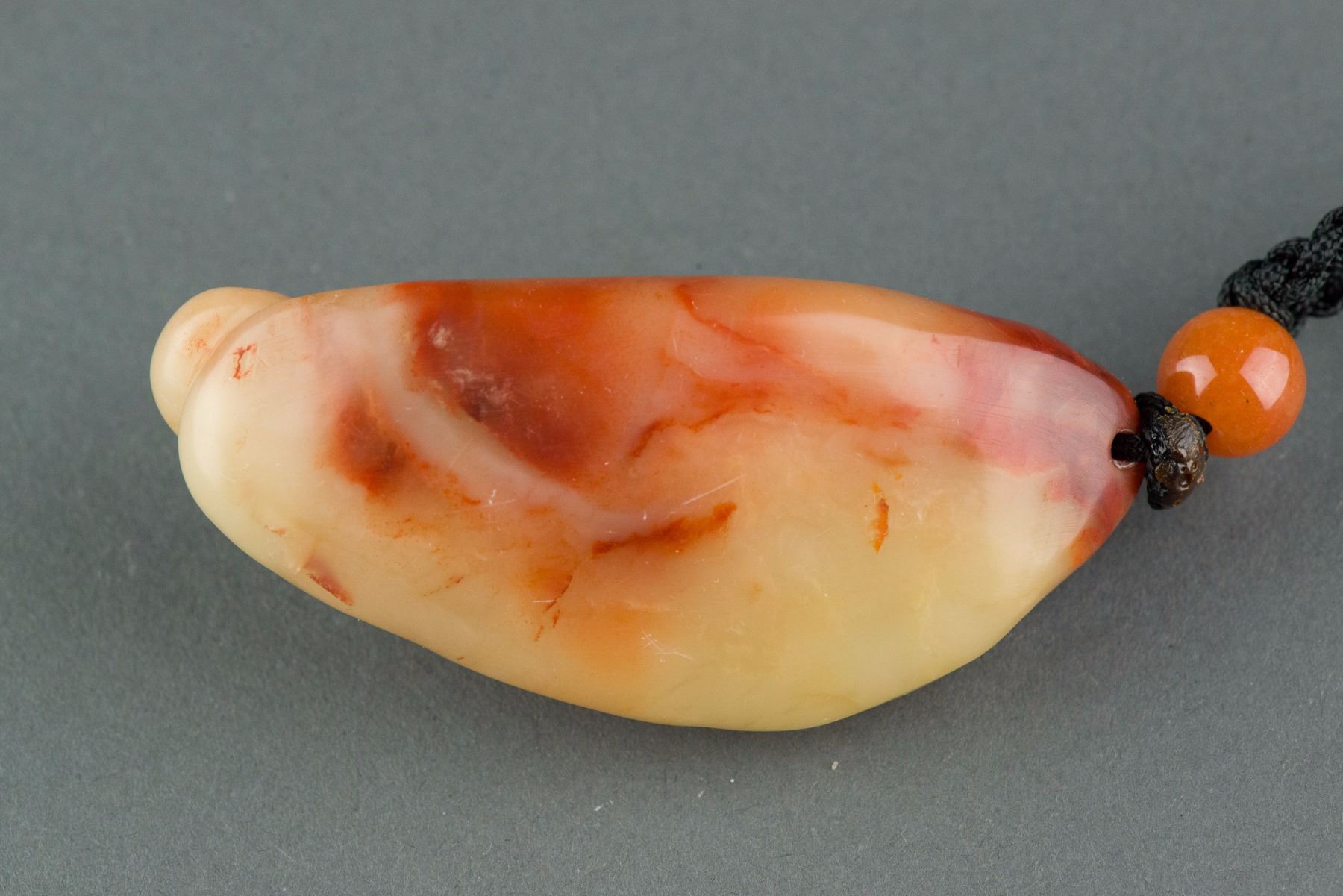 Fine Chinese Shoushan Stone toggle, finely carved with crouching Chilong. The stone of white with red suffusions. H: 7.2 cm, W: 3.2 cm, 82 grams.