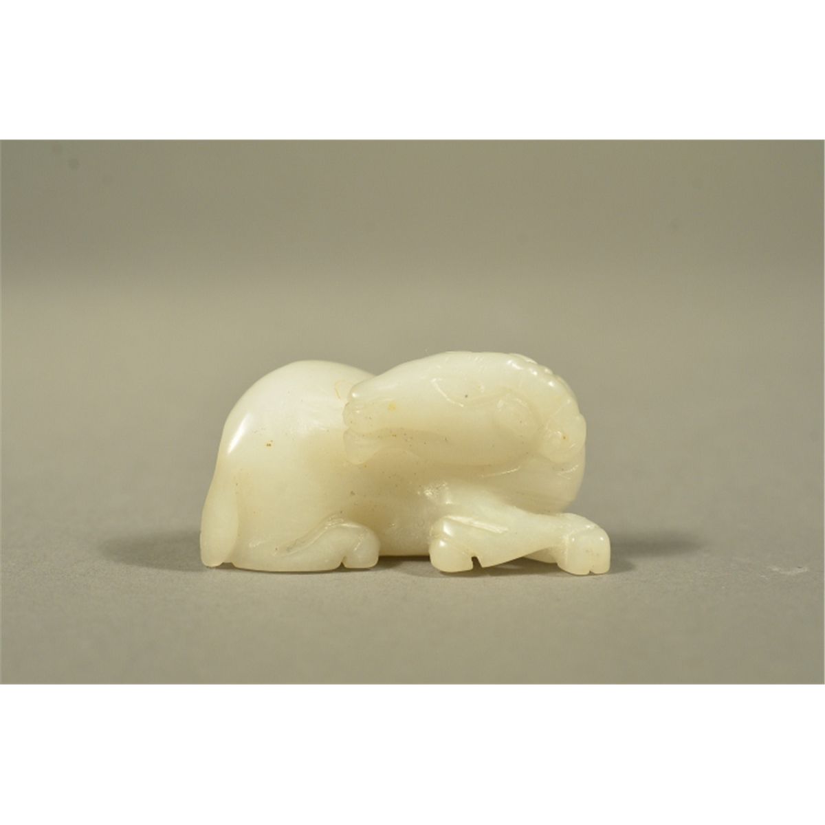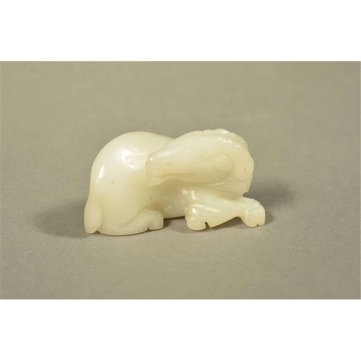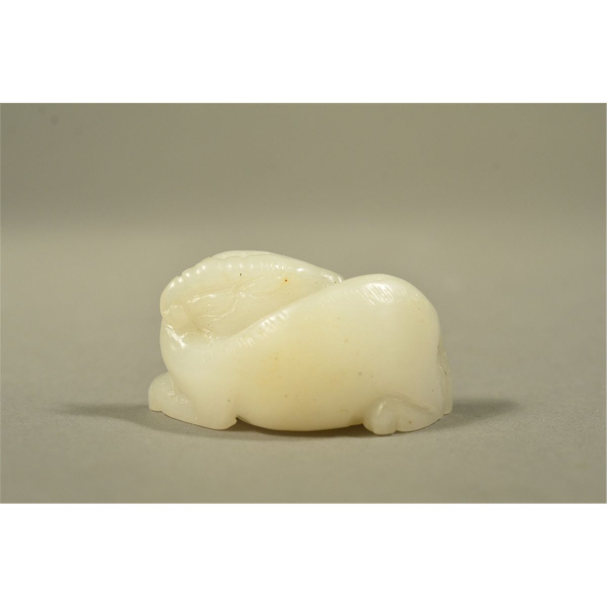 Translucent Chinese carved white jade model of goat; finely incised detailing; L: 5 cm, H: 3 cm, W: 2.5 cm, 40 grams