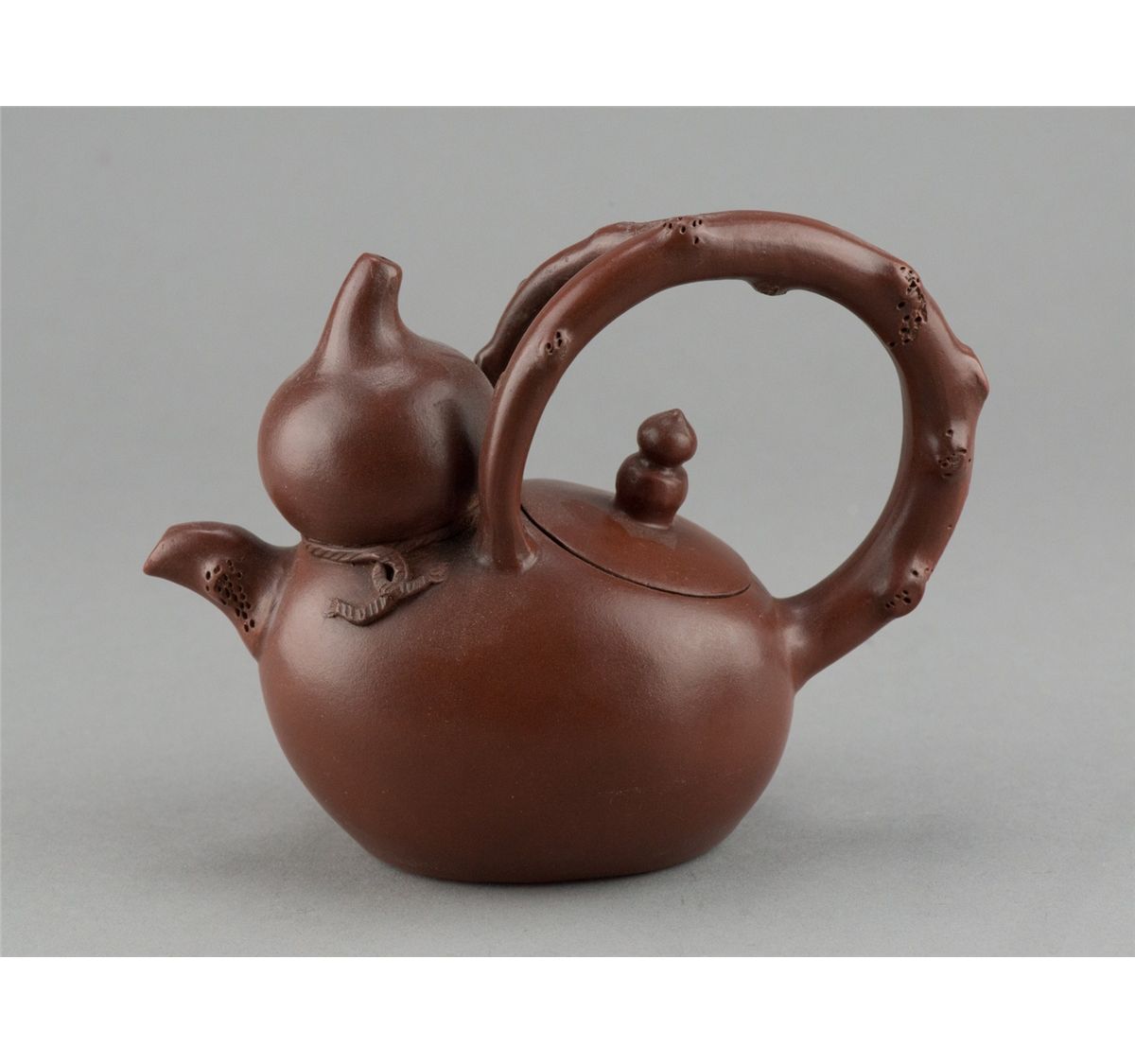 Rendered as a double gourd and root, the underside of the lid and teapot base stamp sealed with artist signature. H: 12 cm, W: 15 cm, 274 grams.