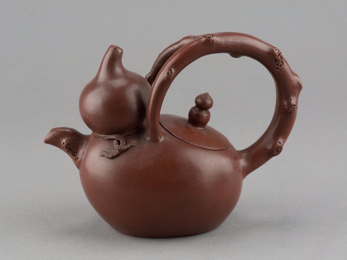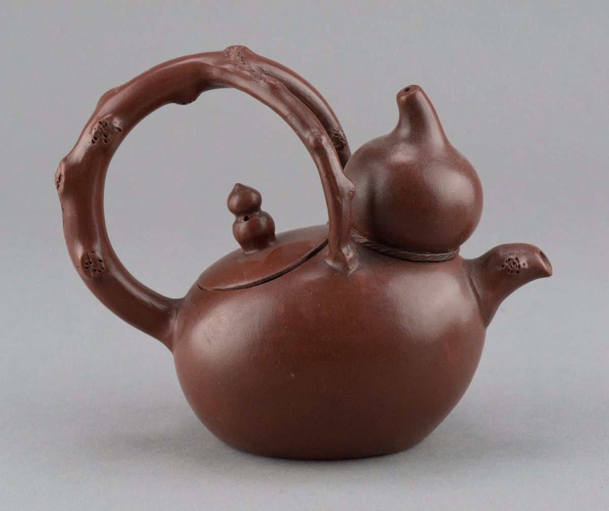 Rendered as a double gourd and root, the underside of the lid and teapot base stamp sealed with artist signature. H: 12 cm, W: 15 cm, 274 grams.