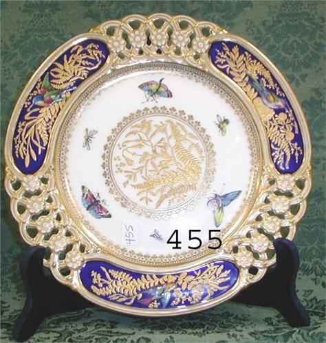 Fine Coalport 9 ¼” lattice border plate with gold decoration and center theme with enamel insects and deep cobalt gold decorated ovals with raised hummingbirds in flight and one on a golden nest.