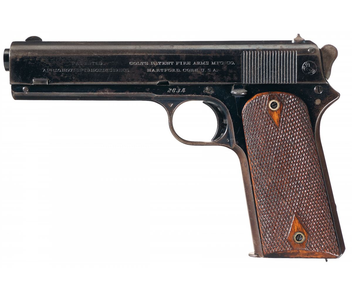 Manufactured in 1909. The right side of the slide is marked with the caliber designation and the left side with the two block patent dates and address with the circled Rampant Colt behind the serrations. The serial number is located on the left side of the frame. The upper left trigger guard bow bears the Colt "VP" triangle proof and the lower is marked with a "6". Features the earlier round checkered hammer with casehardened finish. The remainder of the gun is finished in the standard Colt high-polish blue, except for the trigger, extractor, grip screws, rear sight and magazine release, which are niter blue. Fitted with checkered diamond pattern walnut grips. Complete with the correct blue finish magazine.