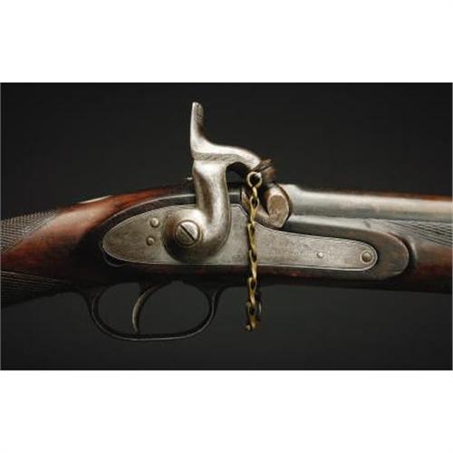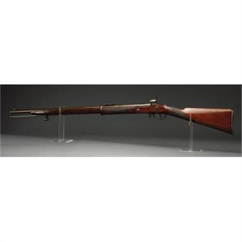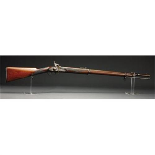 <B>FINE CONDITION M1858 .577 CALIBRE ENFIELD CIVIL WAR PERCUSSION TWO BAND OFFICER'S MODEL RIFLE BY WILKINSON.</B></I> Many of these beautiful rifles found their way through the blockade and were highly prized and much sought after. Many also saw use in the hands of Confederate sharpshooters because of their superior quality workmanship and accuracy. All steel mounted. All metal smooth with much original blue, the balance a pleasing plum brown. Long-range rear sight, original nipple protector and chain attached to a small loop forward on the front trigger guard extension. Lug for attachment of saber bayonet marked “W S 94”. Original ramrod and swivels. Lock and hammer exquisitely hand engraved with “Wilkinson London” forward of the hammer. Interesting field modification with a small aperture neatly cut below the tail of the lock, a trick utilized by experienced riflemen which allowed them to lubricate the inside of the lock without dismantling the rifle. Wood retains most of the original finish. Exquisitely checkered at the wrist and behind the rear band. Small oval German silver escutcheon inlaid and pinned at the wrist. Wood with just some very minor scattered small dents, otherwise perfect. A beautiful Civil War period rifle with strong secondary Confederate association.<BR><BR><b>Shipping:</b> Requires 3rd Party Shipping (<a target="_blank" href="http://www.heritageauctions.com/common/shipping.php">view shipping information</a>)