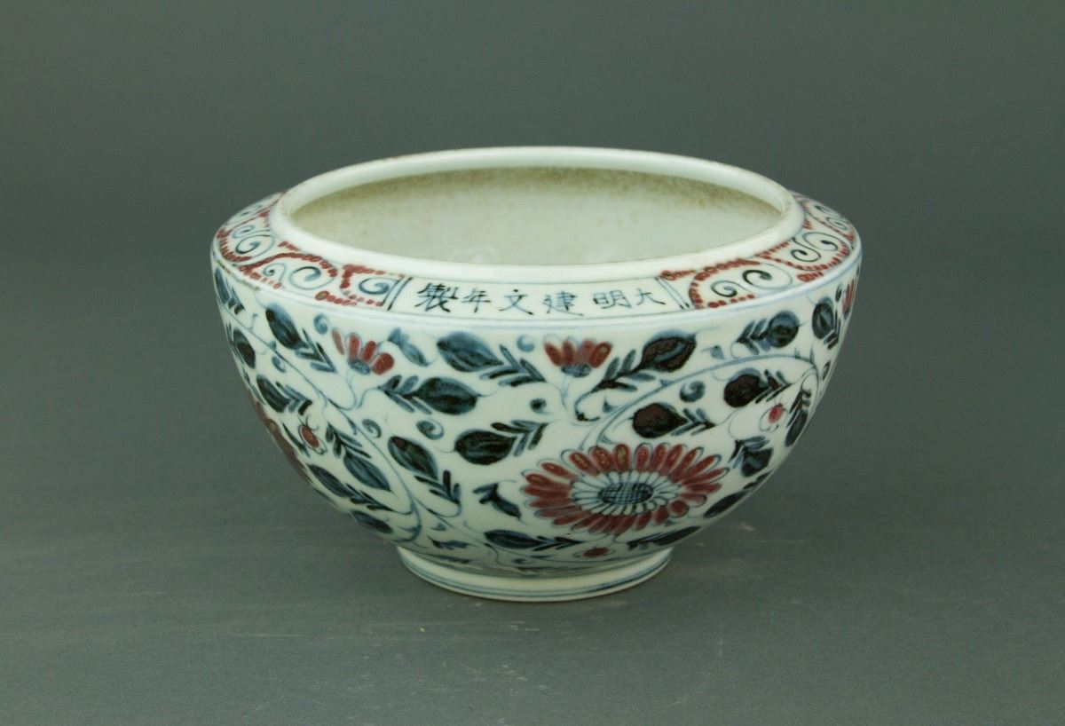 Chinese fine blue and white copper red porcelain bowl; of rounded sides with inverted rim; painted with chrysanthemum scrolls on the interior and exterior; six-character Ming Jianwen mark on rim; H: 10 cm, D: 18 cm, 860 grams