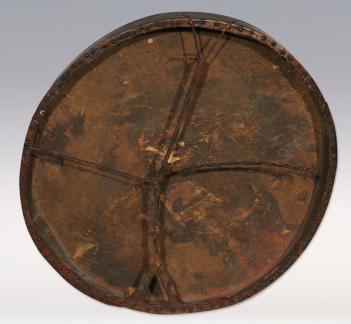 Fine Crow Hand Drum. 19" diameter. Wood frame. Buffalo rawhide. Brass tacks on back. Fine patina. C. 1870. Condition Report: Excellent condition for age. Shows one slight crack in hide in the center of drum.