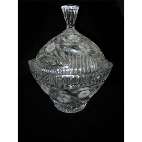 Fine Crystal Covered Dish/Bowl. Made in the early 50's, displays etched and frosted floral decoration. Lid is crowned with a beautiful long finiel. This lovely Dish has the unmistakenly ring of Quality, like music to your ears. Measures 8" tall x 6 1/2" in diameter. MINT!!