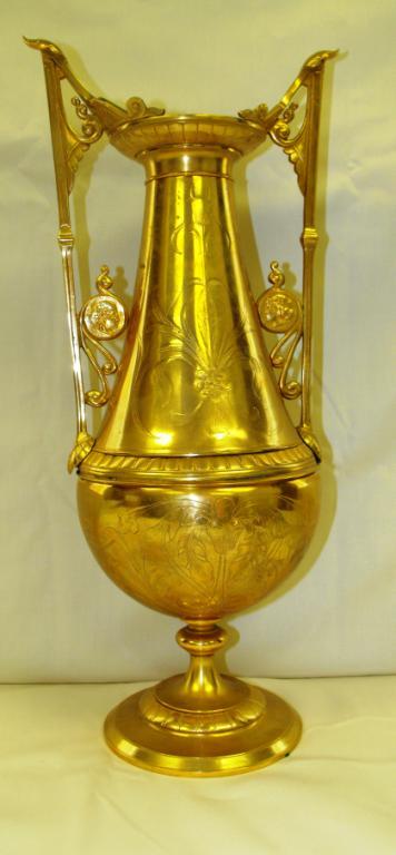 An urn with fancy decorations and handles. Dore bronze circa 1890s. 16"