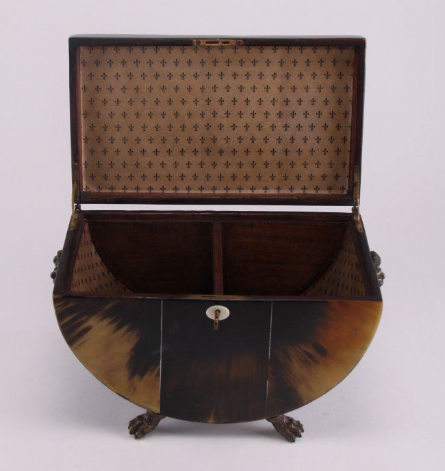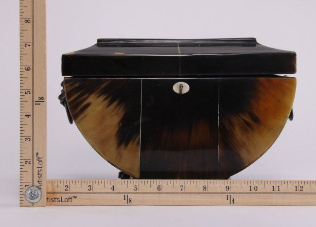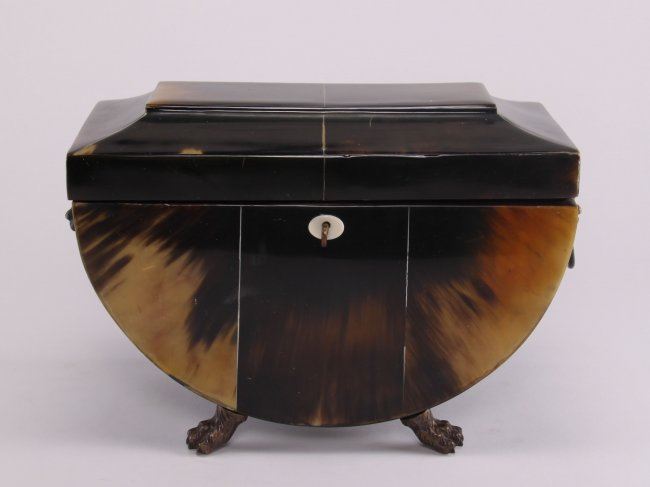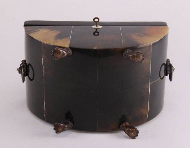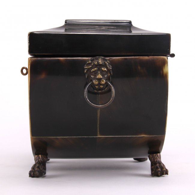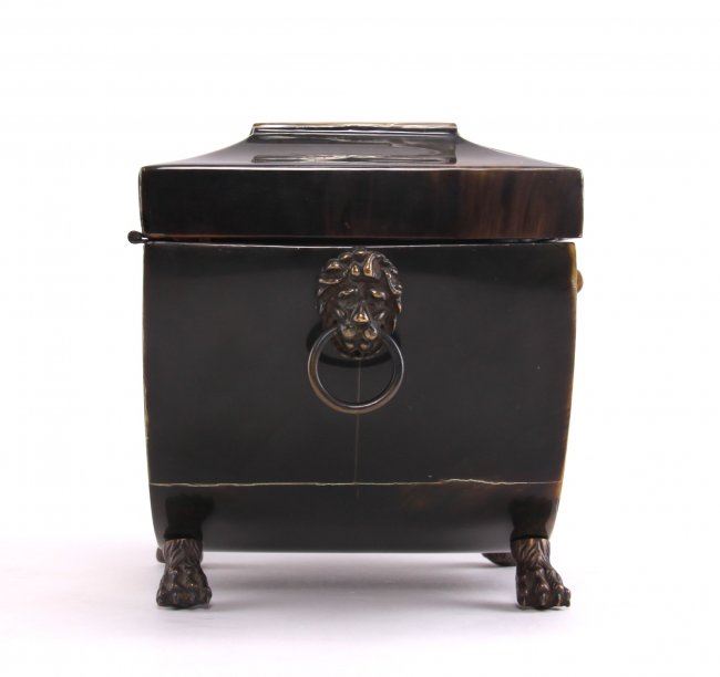 Fine English Regency Horn Covered Tea Caddy, first quarter 19th century, with bronze lion head side handles, with two interior compartments, raised on lion claw feet. (Size: See second photo for measurement.) Photos are part of the description representing the condition report. Pangaea Auctions urges Bidder's to view all attached photos.