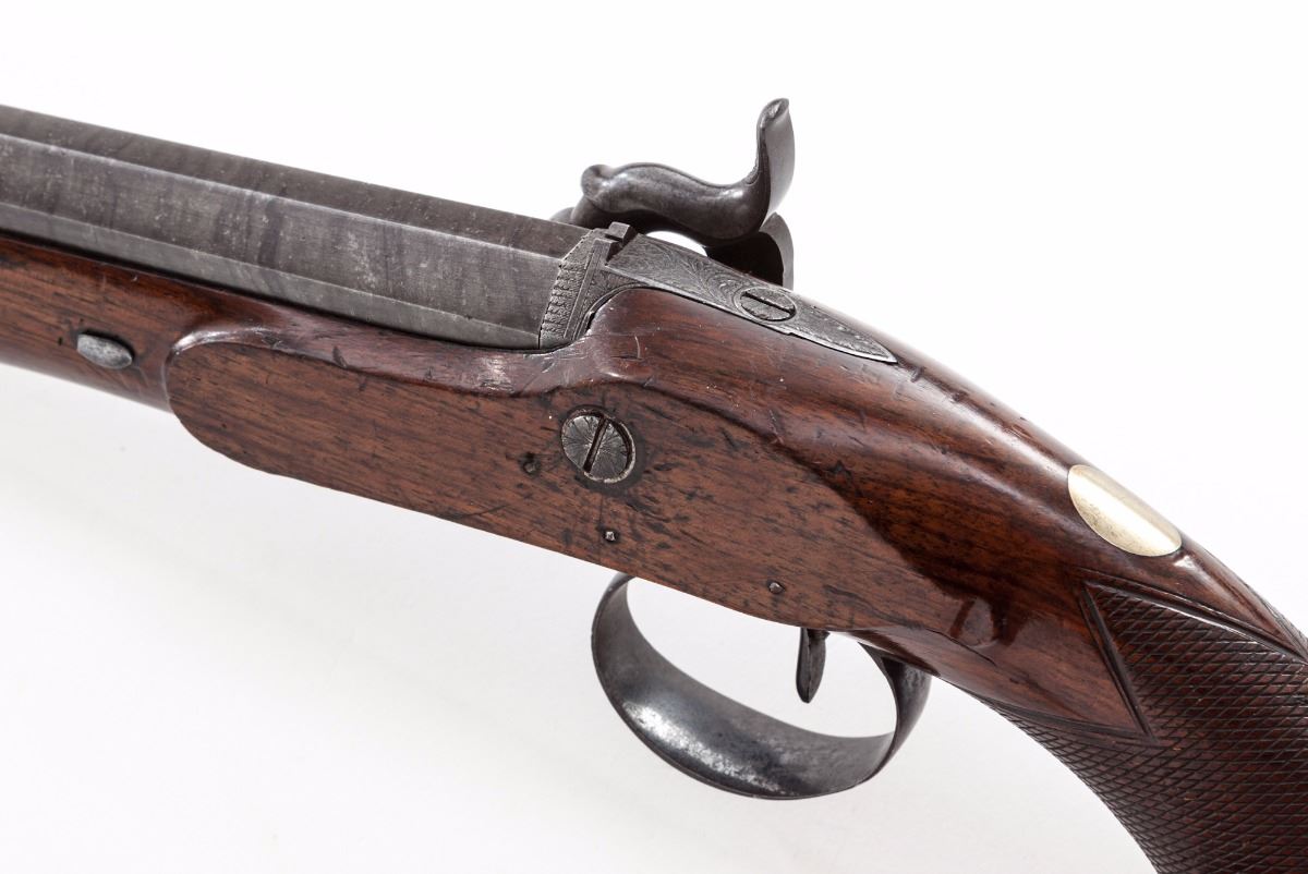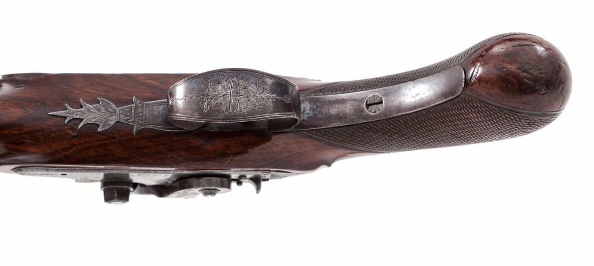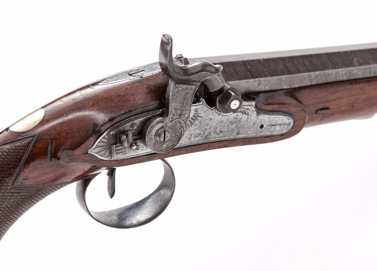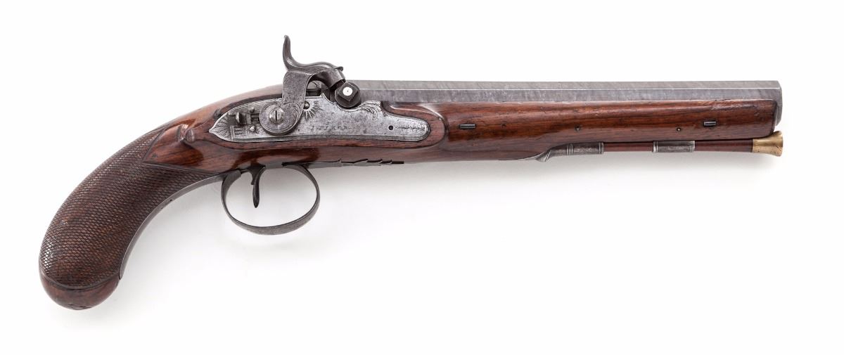 Fine English Single Shot Percussion Pistol, by I. Field, .65 cal., 9'' octagonal barrel, checkered full-length stock of European walnut, lightly engraved hammer, tang and sideplate, with hammer lock and platina inlay to nipple bolster. Condition is excellent. Barrel retains much of its original fluid steel colors with one small area of light pitting to right side barrel flat. Hammer and lockplate have gone bright. Triggerguard retains approx. 60%+ blue with strong details to finial; Stand of Arms is crisp. Stock with light scuffs and minor pressure dings, mostly visible to right sideplate screw. Brass bell-tipped ramrod appears original with worm at opposite end. Good action, fine bore. Est.: $1,000-$1,500. (Antique)