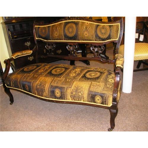 This really lovely small English Victorian sofa is in very good condition. Newly recovered in black & gold period fabric. The very dark mahogany frame is covered in delicate carving. A stunning little sofa, nearly 120 years old & almost 'as new'. It would look perfect in any home