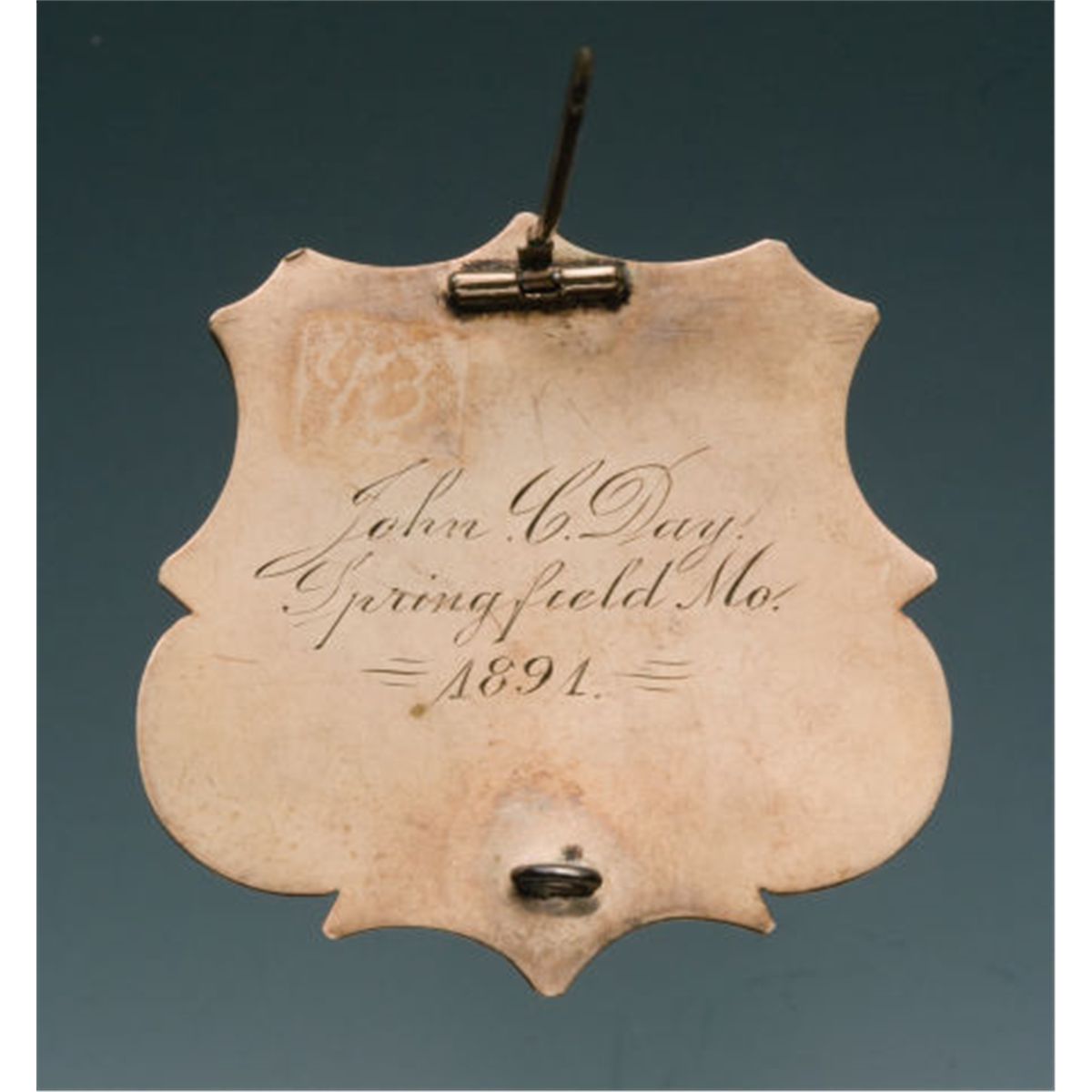 Fine Engraved Antique Gold and Enameled Jeweler-Made Shield Pattern Badge of John C. Day Sheriff, Springfield, Missouri, Circa 1891. 1 7/8-inch tall. Beautiful 14k gold antique, finely-engraved, hard fired black enameled shield pattern badge. Presentation inscription in script reading: "John C. Day/Springfield Mo./1891." T-bar pin and loop catch.Condition: Excellent with light age wear present.