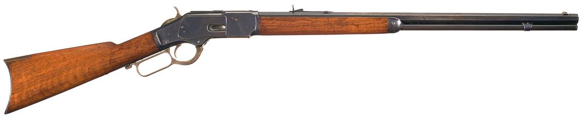Condition: Very fine. The rifle retains nearly 90% of the original blue finish. Finish wear on the barrel is limited to edge wear on the flats. The receiver has at least 85% of the original finish with some scattered pitting of the left side of the receiver and side plate and handling wear on the dust cover and upper receiver tang. The loading lever and hammer have at least 90% of the original casehardened finish. The case colors on the buttplate have aged to a deep brown patina. The bore is bright. The barrel and receiver markings are crisp. The stock and forearm retains approximately 85% of the original varnish finish and are in very fine condition with scattered, minor handling marks. This is a very fine, original, example of a Winchester Third Model 1873 Sporting Rifle with Cody Firearms Museum Fact Sheet.