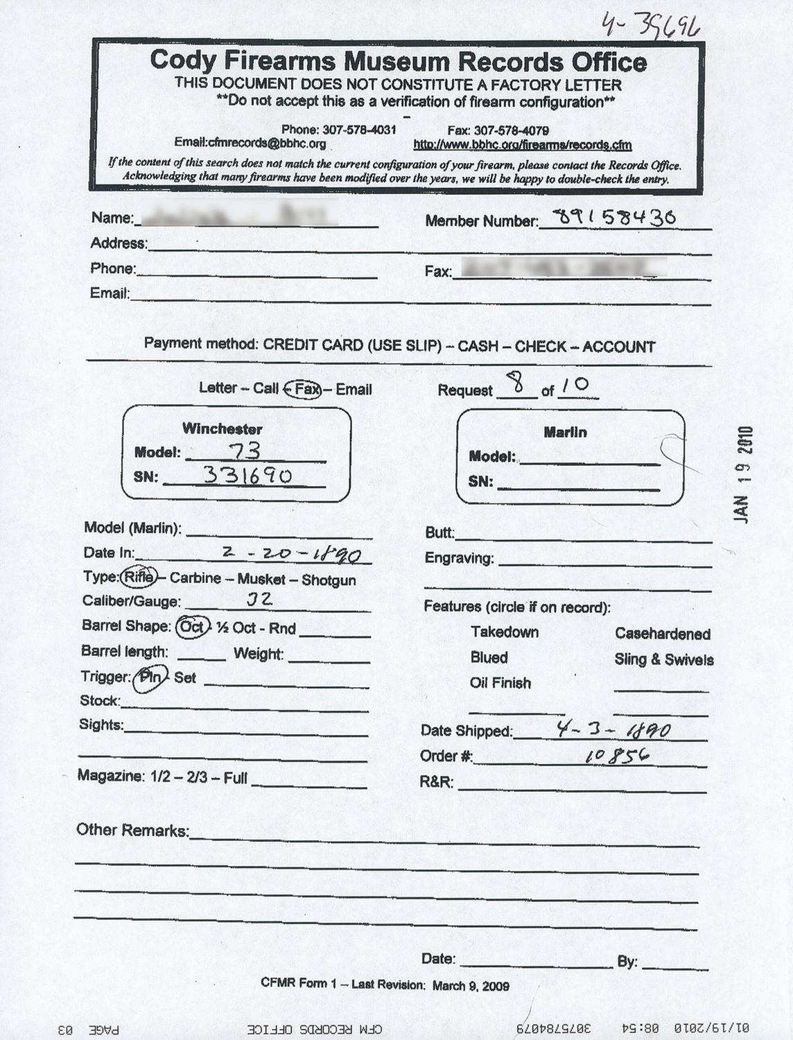 Winchester Third Model Sporting Rifle with Cody Firearms Museum Fact Sheet. The fact sheet states that this rifle was received in the Winchester Warehouse on February 20, 1890. The configuration is listed as "Rifle", caliber "32" with octagon barrel and plain trigger. The rifle has a full length magazine and the barrel is fitted with a nickel-silver front sight blade and a sporting style rear sight. The receiver has the Third Model integral dust cover rail and dust cover with serrated edges. The rifle has a blued barrel, magazine, forearm cap and receiver. The loading gate and front sight are niter blue. The hammer, loading lever and crescent buttplate have a color casehardened finish. The stock and forearm are walnut with a varnish finish. The top barrel flat is roll-stamped with the two-line legend: "WINCHESTER'S REPEATING ARMS.NEW HAVEN. CONN.U.S.A./-KING'S IMPROVEMENT PATENTED MARCH 29.1866 OCTOBER 16.1860.-" ahead of the rear sight. The caliber designation "32 W.C.F." is stamped on the top barrel flat just ahead of the receiver. "32 CAL" is engraved on the bottom of the brass cartridge elevator. The upper receiver tang is roll stamped: "{ MODEL 1873}" in fancy letters with foliate designs at either end. The serial number, "331690B" is located on the lower receiver tang behind the loading lever latch.
