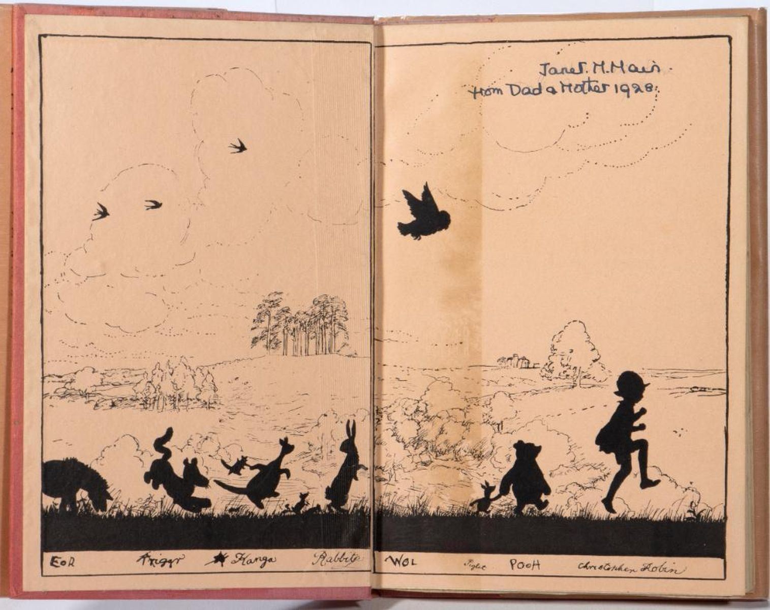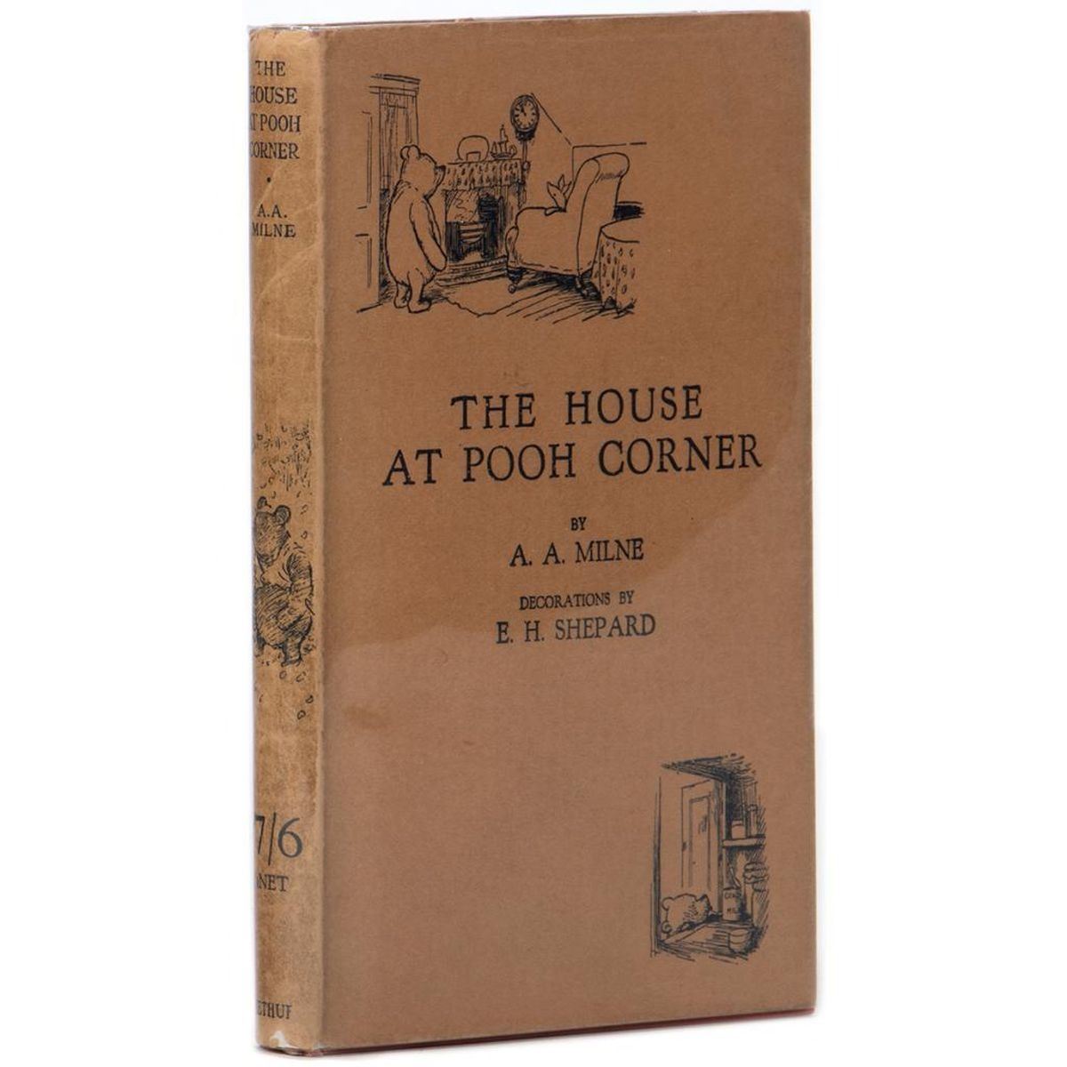 Fine First British Edition of Pooh Corner in Dust Jacket The House at Pooh Corner by A.A. Milne, illustrated by E.H. Shepard. Methuen 1928 first UK edition. Pink cloth boards stamped in gold. Original salmon dust jacket. Pink and black illustrated endpapers, and illustrations throughout by Shepard. About fine in fine dust jacket. Small gift inscription and toning to ffep, a line of toning to rfep (toning where jacket edge touches the book.