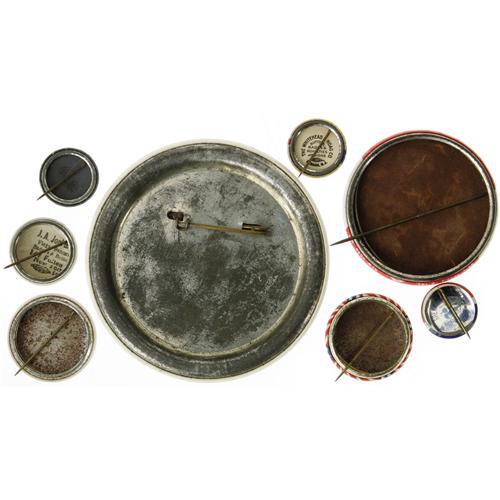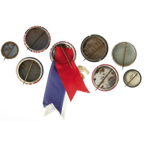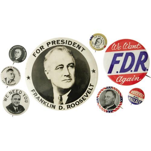 <B>Fine Franklin D. Roosevelt Button Collection of Sixteen Different.</B></I> As shown; includes two uncommon 1928 gubernatorial buttons, two nice jugates, and one quite scarce item: a black and white 1" celluloid version of a typical litho picture pin with quarter-turned portrait. All in excellent condition. Total individual retail value approximately $500-$600.