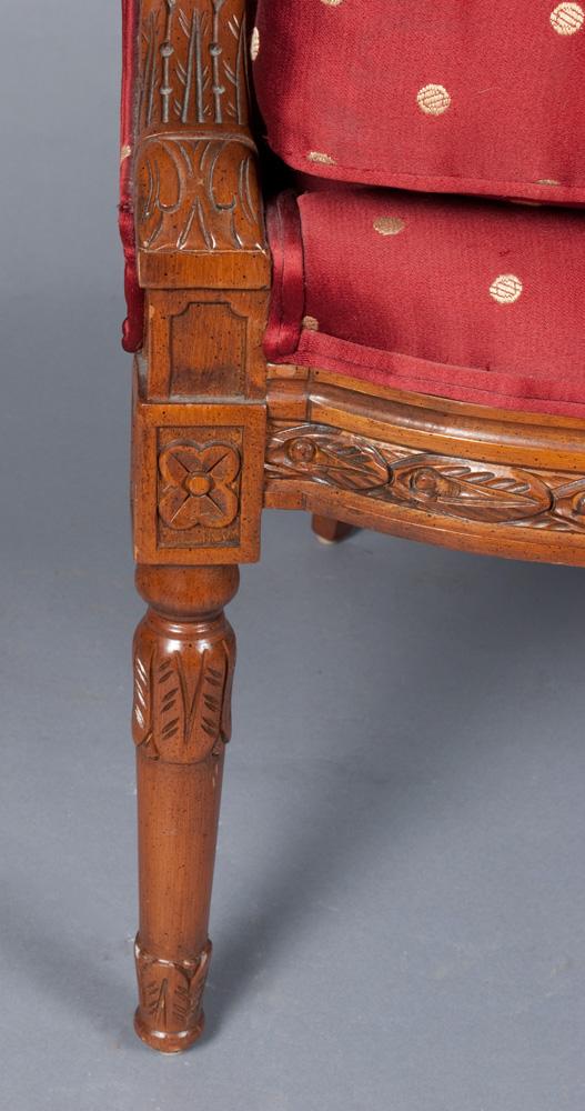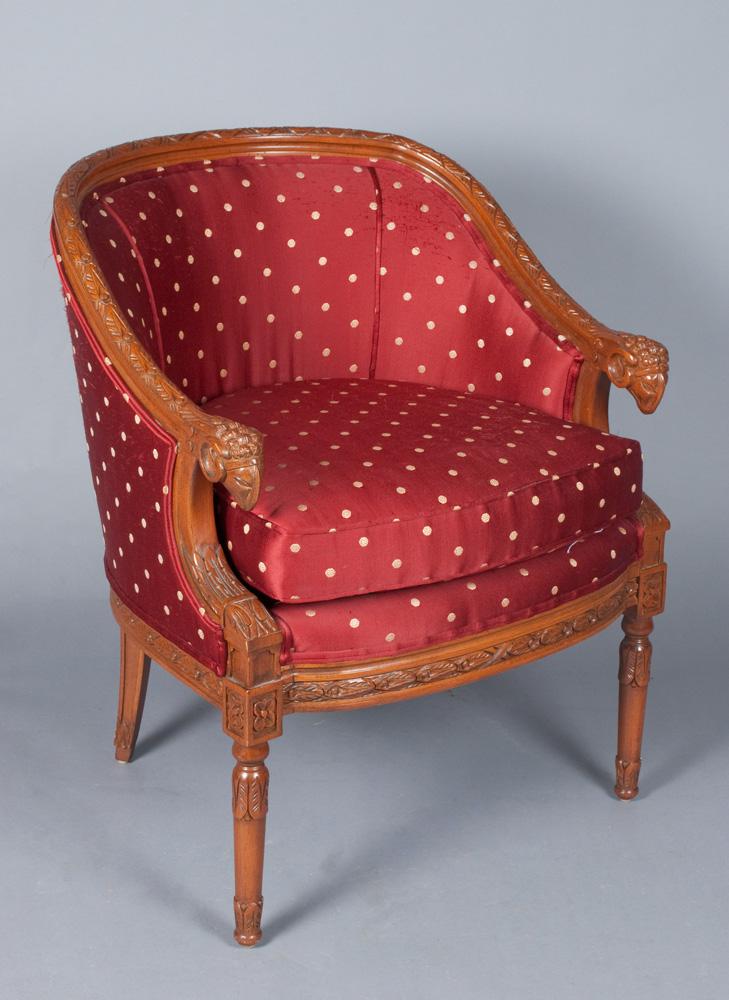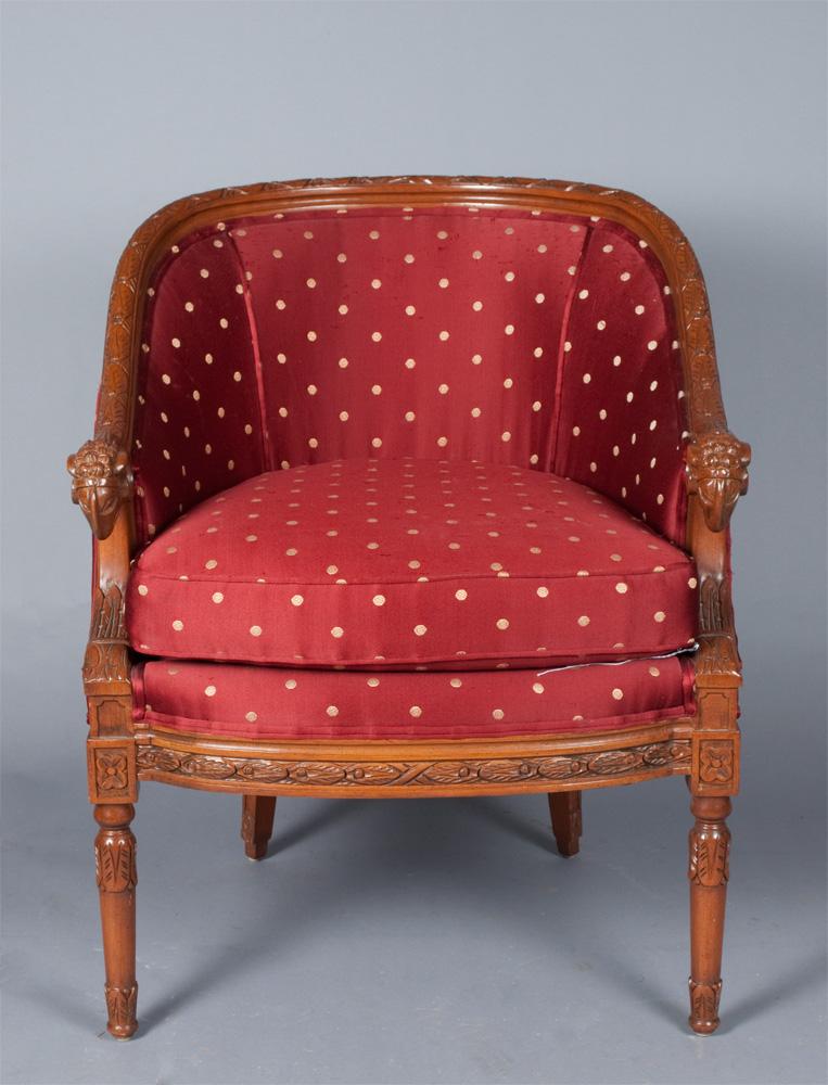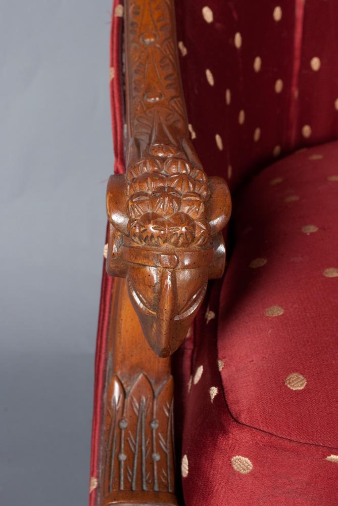 The chair with carved apron, rail and legs, the arms terminating with carved rams heads, with burgundy and gold upholstery, very nice, 33"H x 26.5"W x 21"D.