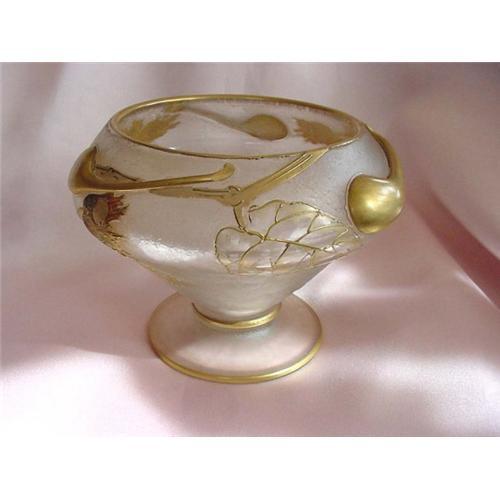 Very fine early Art Nouveau art glass vase made by Legras & Cie in St. Denis, Paris. This gorgeous acid etched vase is adorned with a foliate motif and heavy applied gold. Vase height is 4 1/2", maximum width is 5 3/4" and base diameter is 3 7/8". Base is marked "L" & "Cie" and "St. Denis-Paris" below. There is a tiny rough spot and tiny leaf shaped smooth indentation on the bottom base. Otherwise, excellent condition. Circa 1900.