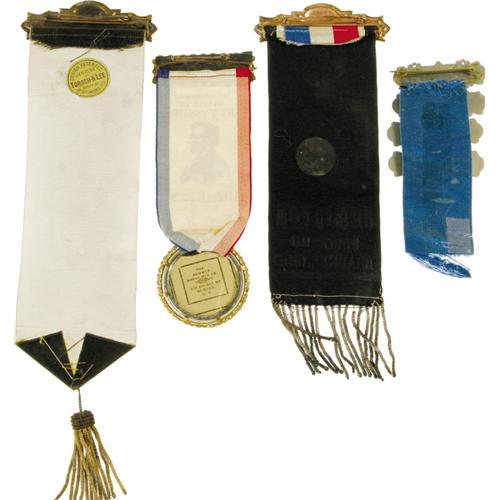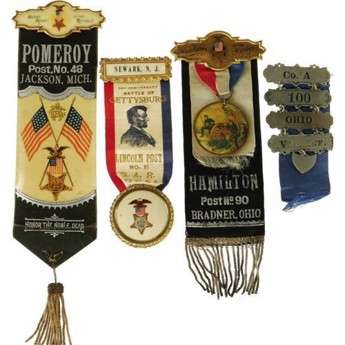 <B>Fine G.A.R. Medal Group</B></I> A fine set of four (4) medals and ribbons worn by Civil War veterans at various encampments and meetings of the Grand Army of the Republic. Includes an unusual celluloid ribbon bearing images of the American flag and various G.A.R. insignia. Also includes a multi bar ribbon from "Co. A 100 Ohio Vol. Inf." together with a nice silk ribbon bearing Lincoln's image honoring the 50th anniversary of the Battle of Gettysburg from the 1913 encampment, the last of the great reunions. Ribbons overall good with some fraying, medals bear a few minor faults. Together, four pieces.<BR><BR><b>Shipping:</b> Miscellaneous Collectibles, Smal (<a target="_blank" href="http://www.heritageauctions.com/common/shipping.php">view shipping information</a>)