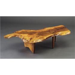 Fine GEORGE NAKASHIMA walnut coffee table with free-edge plank top, inclusions and two rosewood butterfly joints, on plank base with two tapering dowel legs. (Purchased directly from Nakahsima's studio, provenance available.) Unmarked. 13" x 57" x 31" $10,000 - 12,000