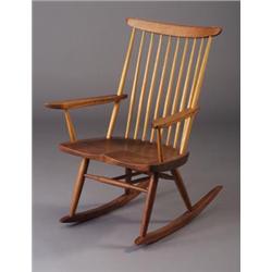 Fine GEORGE NAKASHIMA walnut spindle-back rocker, 1979, with paddle arms and saddle seat. (Yukari Takahashi Simonds Collection). Signed George Nakashima/May 1979 and original owner's name. 35 1/2" x 25" x 26" $2,000 - 3,000