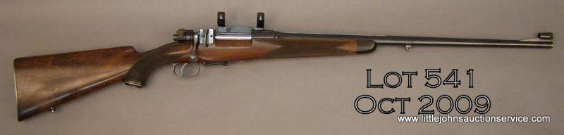 Fine GRIFFIN & HOWE signed and numbered #619 pre-war sporting rifle in 7x57 Mauser cal., with pre war commercial Mauser action. Barrel is stamped "Poldi-Anticorro" with trademark . Finely made checkered select walnut stock, raised andmilled rib on barrel, quick release floor plate gold inlaid "TWPL" in large block letters with milled steel butt plate. Showing trap Griffin & Howe quick disconnect side mount and Lyman receiver sight on right side of action withaperture removed. Near fine condition showing just normal use and storage. Nice figuring in wood. A classic Griffin & Howe rifle which could be researched through this well known American outfitter. Est. $2,500-$5,000.