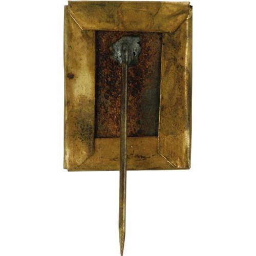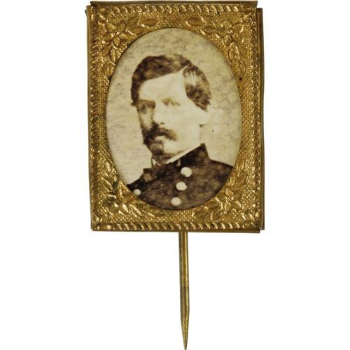 <B>Fine George McClellan 1864 Campaign Pin.</B></I> Paper photo, an uncommon pose, is set into typical "gem" sized brass foil frame, with original metal back and pin. Excellent condition.