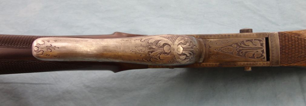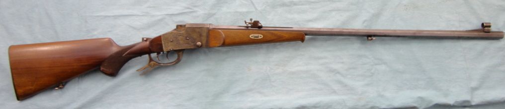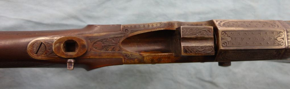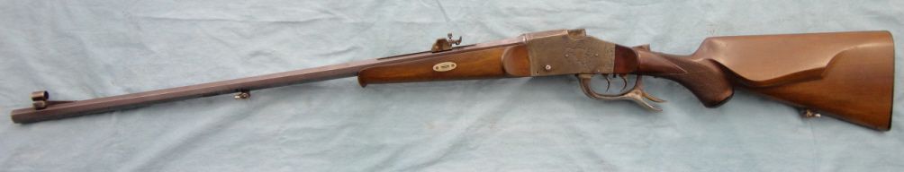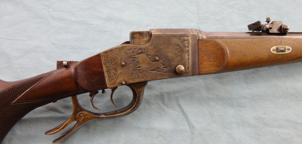 #6640; 22 cal. Bbl. is marked "Venuswaffenwerk, Zella-Mehlis" w/small stamps "Made in Germany" on both sides of the 28 1/2" oct. bbl. Bore is bright w/good rifling. Blued bbl. in good condition but w/some small rust spots mainly on underside of bbl. Single shot falling block Martini action w/dbl. set triggers. Adjustable front & rear target sights. Heavily engraved game scene receiver. Checkered walnut stock in good overall condition. And a fine example of an early German 22 Target Rifle.