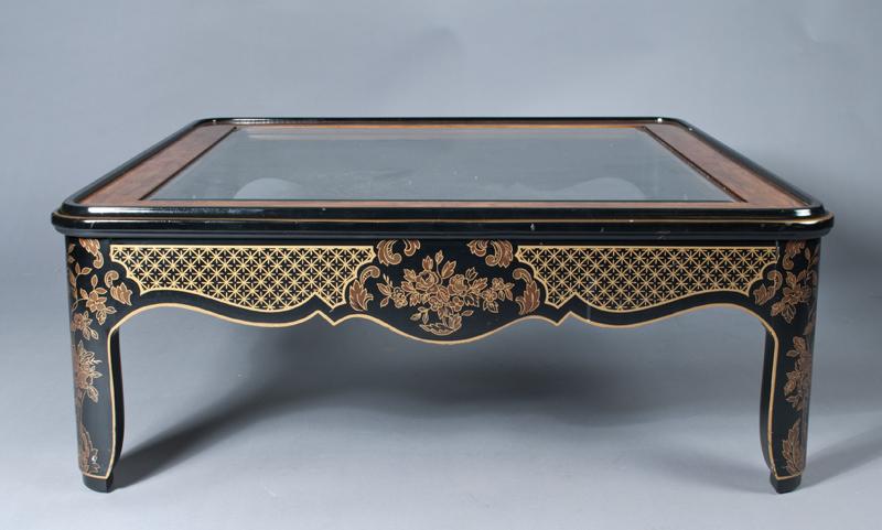 Square coffee table with beveled glass top, and painted black wood with floral designs in the Asian flair. 16" H x 42" W, minor nicks and abrasions consistent with use.