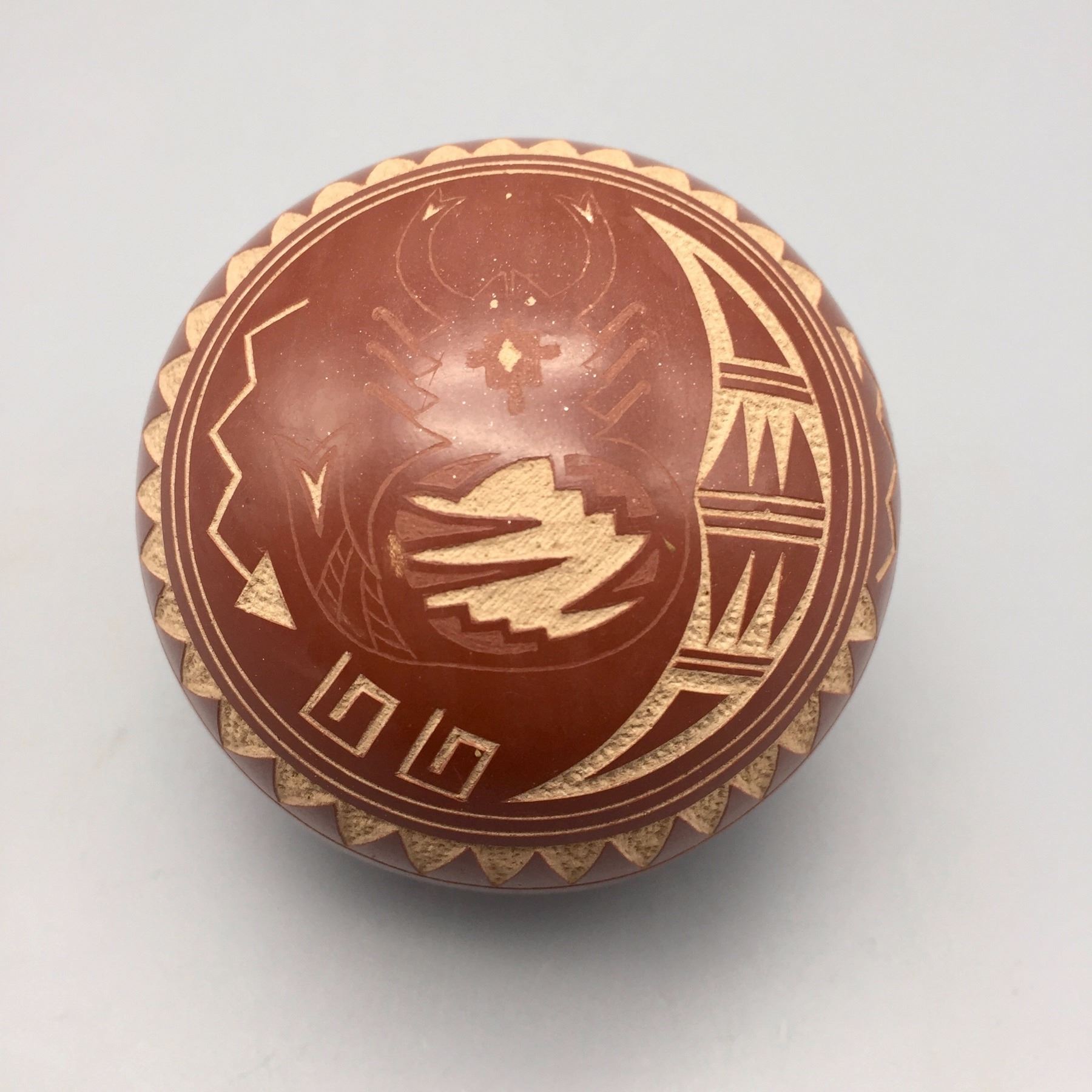 Maker: Glendora Fragua. Approx. Age: Circa 1982. Size: Measures 2 3/4” w x 2 1/2” h. Additional Info: Very fine round pottery art. Condition: Good, New, old stock (NOS) from dealer who is retiring. Please look closely at the pictures - they are an important part of our description. Shipping: There will be a $7 handling / packaging fee for shipping this lot. The actual cost of postage will be added on top of that.
