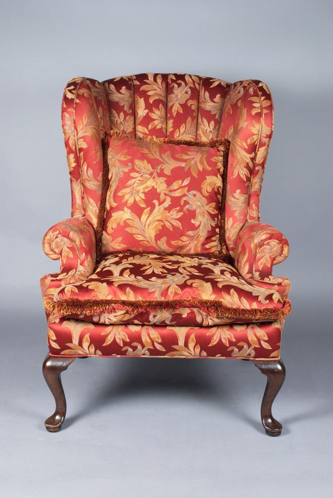 With queen anne feet,brick red floral upholstery, and matching pillow, 48"H x 35"W, very nice.