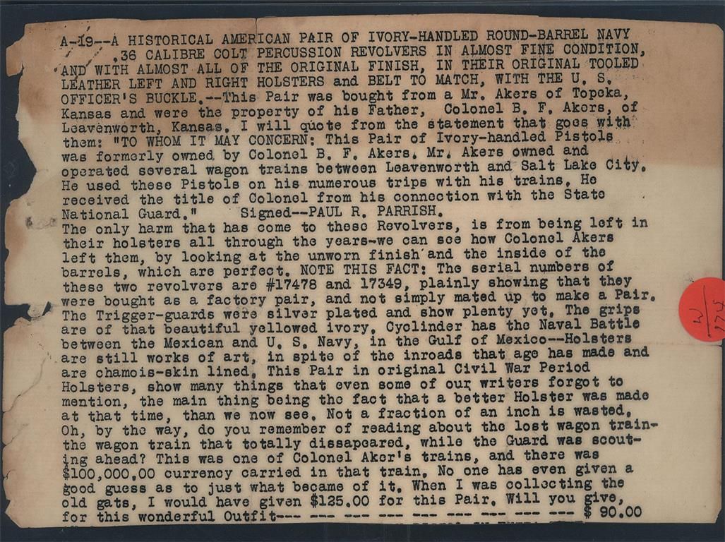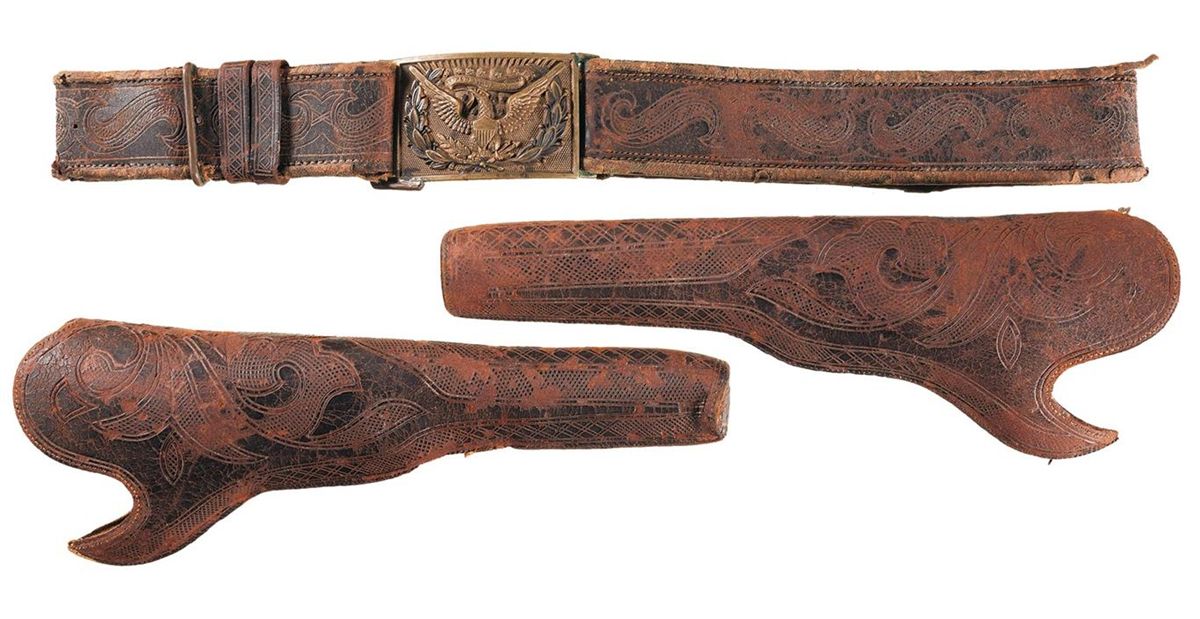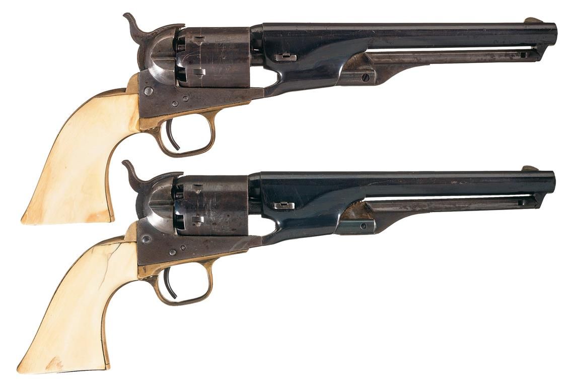 A) This pair of Model 1861 Navy revolvers (serial numbers 17349 and 17478) were manufactured by Colt c.1864. A copy of an old dealer sales letter for these revolvers describes them as the property of Colonel B.F. Akers of Leavenworth, Kansas, and states that Colonel Akers operated freight wagon trains between Levenworth and Salt Lake City. Preliminary research confirms that B.F. Akers was listed as a resident of Levenworth, Kansas, and a livery stable owner in the 1860 Census and confirms that he operated freight wagons between Levenworth and both Denver and Salt Lake City in 1864 at the height of the Cheyenne and Lakota Souix raids on wagon trains and ranches in Kansas, Nebraska and Colorado. A short biography for a Benjamin Franklin Akers (1829-1880) is posted on the Kansas Historical Society webpage. According to the Society, Akers opened a stable in Leavenworth, Kansas, in the early 1860s and supplied horses to the Army and ran mule and oxen freight trains to Denver. After the war, Akers, along with his partner Colonel Amasa Sprague, established the Kansas Stock Farm. Today, Akers' home remains at 1645 Louisiana St. in Lawrence, Kansas. (Note that the Society did not mention Akers holding the rank of Colonel.) The revolvers have the Colt high polish commercial blue finish on the barrels and cylinders with casehardened frames, loading levers and hammers. The brass trigger guards and back straps are silver plated and both revolvers have one-piece factory ivory grips. The revolvers have nickel silver front sight blades, channels in the frame capping cut-outs and borderless knurled hammer spurs. Both cylinders are roll-engraved with the Texas Navy battle scene and "COLTS PATENT No." Both revolver barrels are roll-stamped with the one-line legend "- ADDRESS COL. SAMl COLT NEW-YORK U.S. AMERICA-". "COLT'S/PATENT" is light stamped on the left side of both frames. "36 CAL." is stamped on the left shoulder of both revolver trigger guards. The full serial number "17478" is stamped on the bottom of the barrel lug, frame, trigger guard and back strap of Revolver A and the partial serial number "7478" is stamped on the revolver cylinder. Revolver B has the full serial number "17349" stamped on the bottom of the barrel lug, frame, trigger guard and back strap and the partial serial number "349" stamped on the revolver cylinder. All the visible serial numbers on both revolvers match. The revolvers are accompanied by a rare pistol belt and double holster rig with U.S. Army officer pattern brass saber belt plate. The rig consists of two matching "California" pattern holsters and a leather belt. The semi-contour holsters have the distinctive California recurved throat profile, riveted and sewn-in toe plug with buckskin linings. The holsters are made of medium weight russet leather and decorated with incised floral and cross-hatched decoration. The pistol belt is made of folded russet leather and decorated with the same floral and cross-hatched decorations as the holsters. There are no visible maker's marks on the holsters or the belt but the style and decoration is very similar to holsters made by E.L. Gallatin of Denver, Colorado, c. 1860-1865. The holsters and belt are clearly contemporary with each other and the sales document indicates that the holsters and revolvers were purchased directly from B.F. Akers' daughter in Topeka, Kansas.