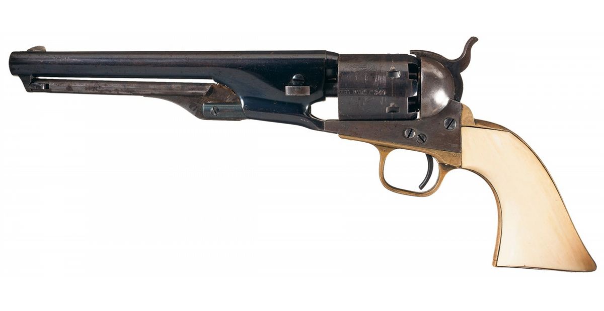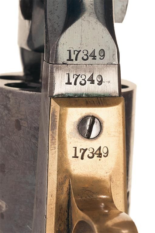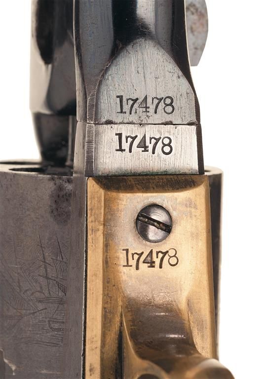 Very fine. The revolver retains 85% of the original high polish blue finish and show light handling wear. The blue finish on the barrel has a few minor handling marks and several very minor spots of surface discoloration. The cylinder retains nearly all of the roll-engraved scene. The safety pins on the cylinder remains intact and the percussion nipples show minimal flash pitting. The loading lever, frame and hammer retain traces of the slight faded case colors. The brass trigger guard and blackstrap retain 20% of the delicate silver plated finish which is mostly contained in protected areas. The frame screws have traces of niter blue finish and are free from screw-driver battering. The ivory grips are slightly yellowed from age and are very good overall showing a hairline crack on the left side and several hairline age cracks on the heels. The action is tight and functions well.