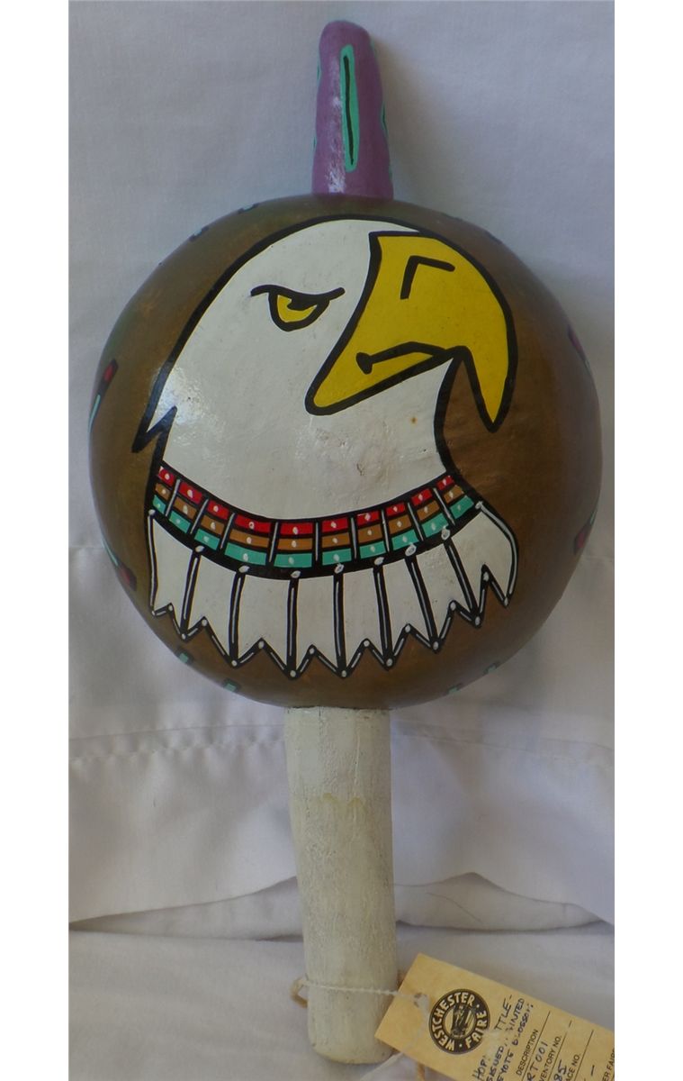 Fine Hopi Rattle, circa 1980s. Made of gourd and wood. Measures 12" x 6" x 3.5". Hopi tribe, Arizona, USA. Signed "Andy Selestew Hopi". Eagle & peyote blossom painted on either side. From the private collection of Mr. Wayne Reed. Condition: Minor nicks and scuffs. Shipping: $14.