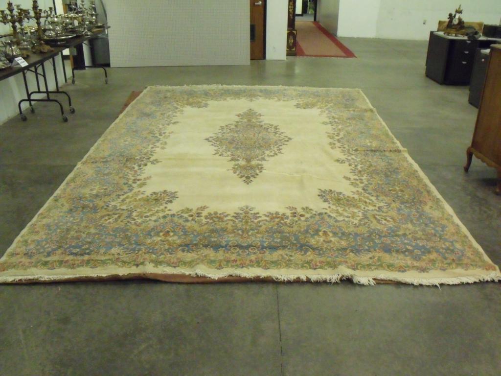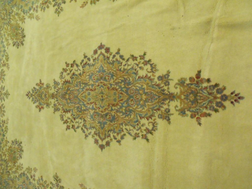 Very large Classic Kerman rug featuring traditional Persian Artistry with ornate central medallion the boarder in images of gold and blue colored crown jewels in delicate arrangement. The overall design of red flowers with pink green and