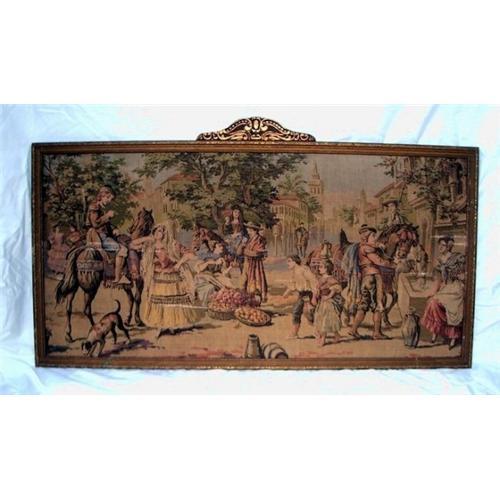 This richly executed mid 19th century Italian tapestry depicting romance in a Spanish town square scene during market time is mounted and framed in an old hand carved wood frame. Featuring a woman selling fruit to a man and his mounted wife. A Prince courting his lover, and a squire courting a maid. This fine tapestry is made of Picardy and Arras wool, Italian silk and Cypriot gold and sliver gilt thread. Circa 1850. h. 22" w. 39".
