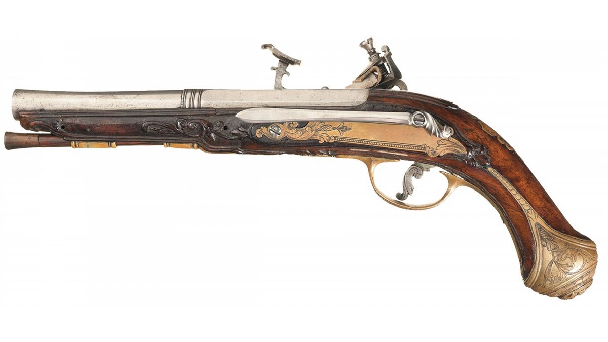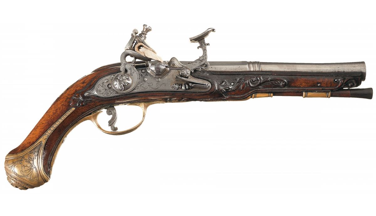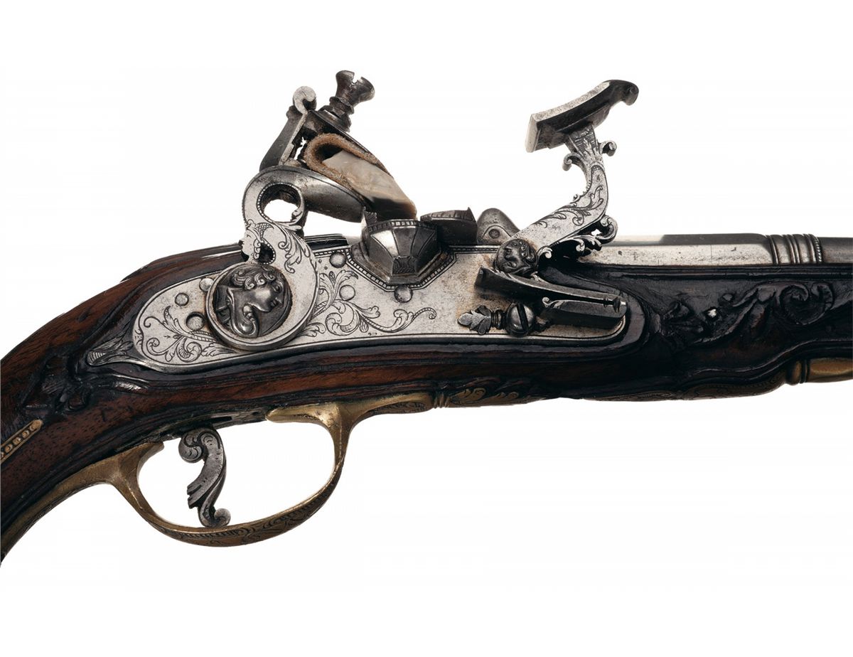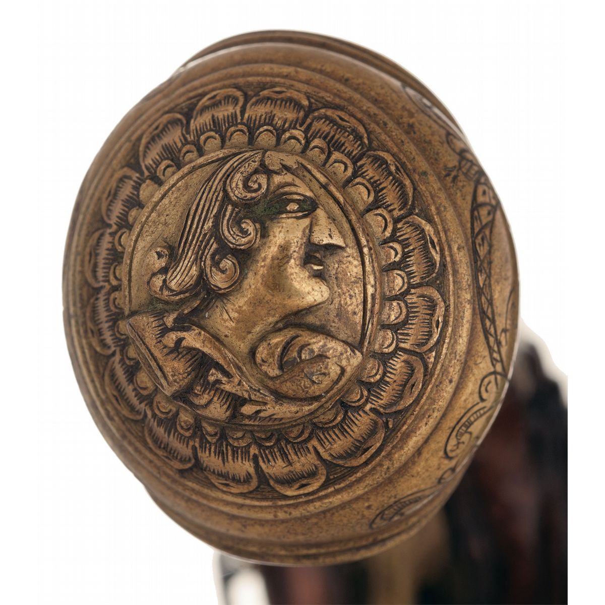 The barrel mid-section has raised bands with the barrel tang exhibiting an engraving. The lock plate is scroll engraved and the inside of the lock plate is signed "Brento". The flash pan has a sliding cover which functions well. The action components are artfully shaped and chiseled with a raised relief bust on the hammer screw and frizzen pivot screw. The trigger is artfully shaped. The furniture is brass that has a well executed engraving. The butt cap has a raised bust that is similar to the bust featured on the hammer and frizzen pivot screws. The stock has a carved scroll pattern and an ornate brass thumb rest. An iron belt hook is mounted on the left side. The wooden ramrod has a horn tip. Provenance: The William Ashby Collection
