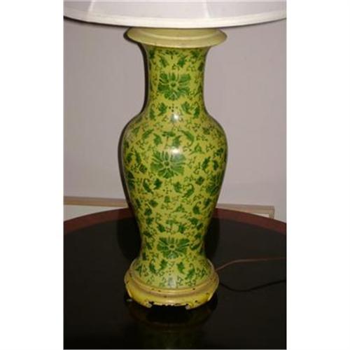 </font></strong>This very fine Kutani vase mounted as a lamp is traditionally decorated with a green arabesque design on a lemon yellow ground. This lamp was originally in one of the country's finest hotels. The rosewood stand has been laquered yellow and has some chipping of the lacquer. The brass cap was also laquered in yellow. The vase is 19" in height and the lamp would stand 36" tall with an empire shade.</font>