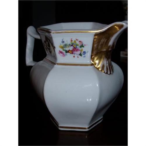 This is a rare American made East Coast 1830's pitcher. The pitcher is boldly molded with handpainted flowers and gold gilt copying English and French Paris porcelain. With a nice high handle and nice gold gilt spout. Measurements: Height 8" depth 8" 1/2. Wide 7" 1/2.