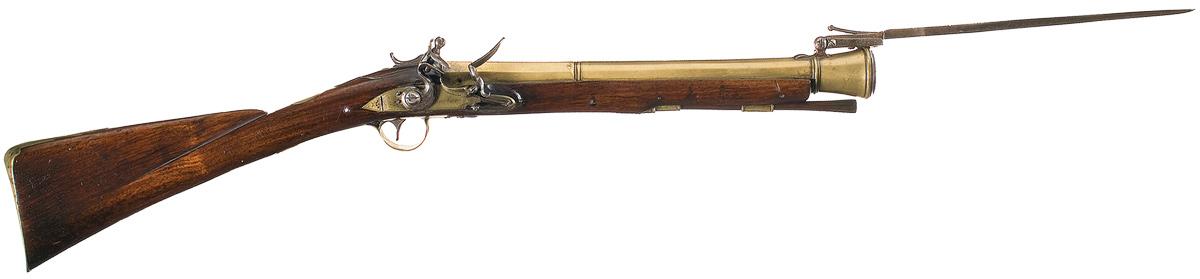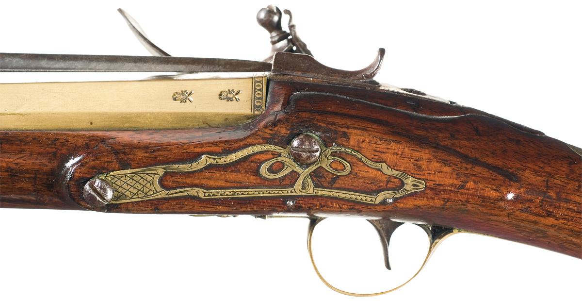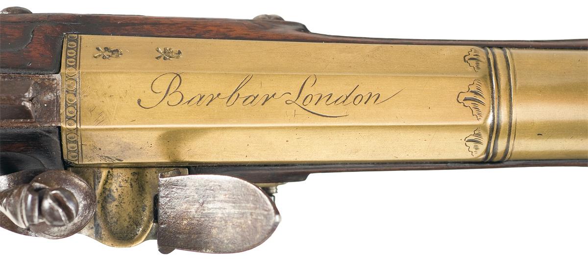 Establishing himself in London circa 1688, Louis (aka Lewis) Barbar was an expatriate French Huguenot who would later become armorer to the Kings George I and II, with his work continued by his son, James Barbar, following Louis' death in 1741. Cannon style muzzle, with "Barber London" on the top flat, a pair of crossed scepter proofs on the upper left, light engraving around the breech and a 10 3/4" triangular spike bayonet with spring loaded hinge and a sliding latch on the tang. The lock and hammer are lightly border engraved, with "Barbar" ahead of the hammer, floral engraving on the trigger guard, and an engraved and pierced-through brass reverse plate. Smooth stock, with horn and screw tips on the ramrod, straight wrist, and a flat brass buttplate with engraved flags and drum on the heel. Overall length is 29 1/2 inches.