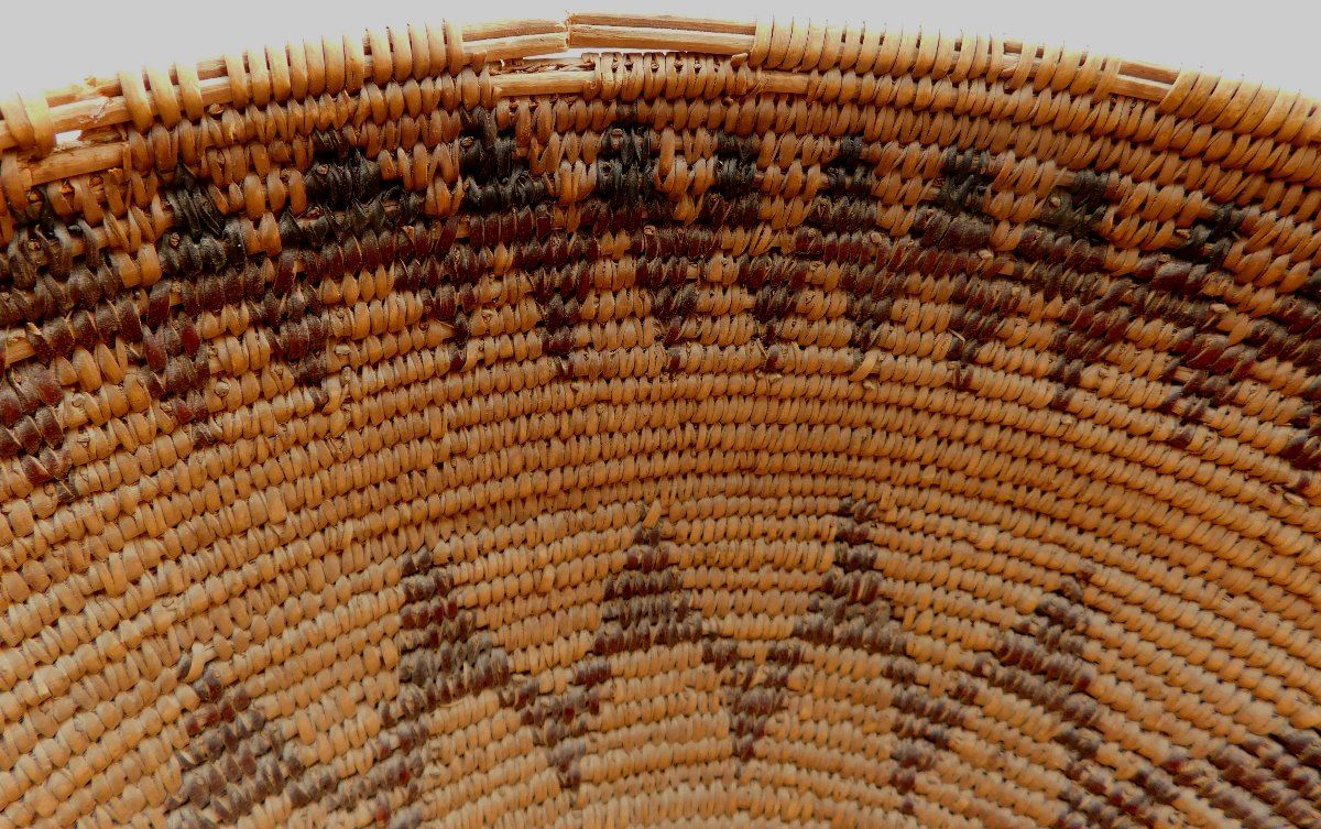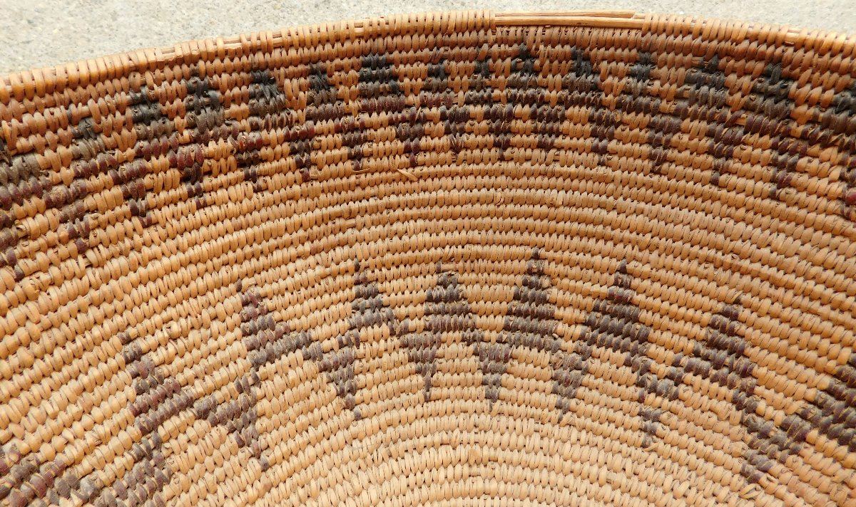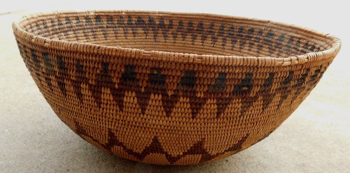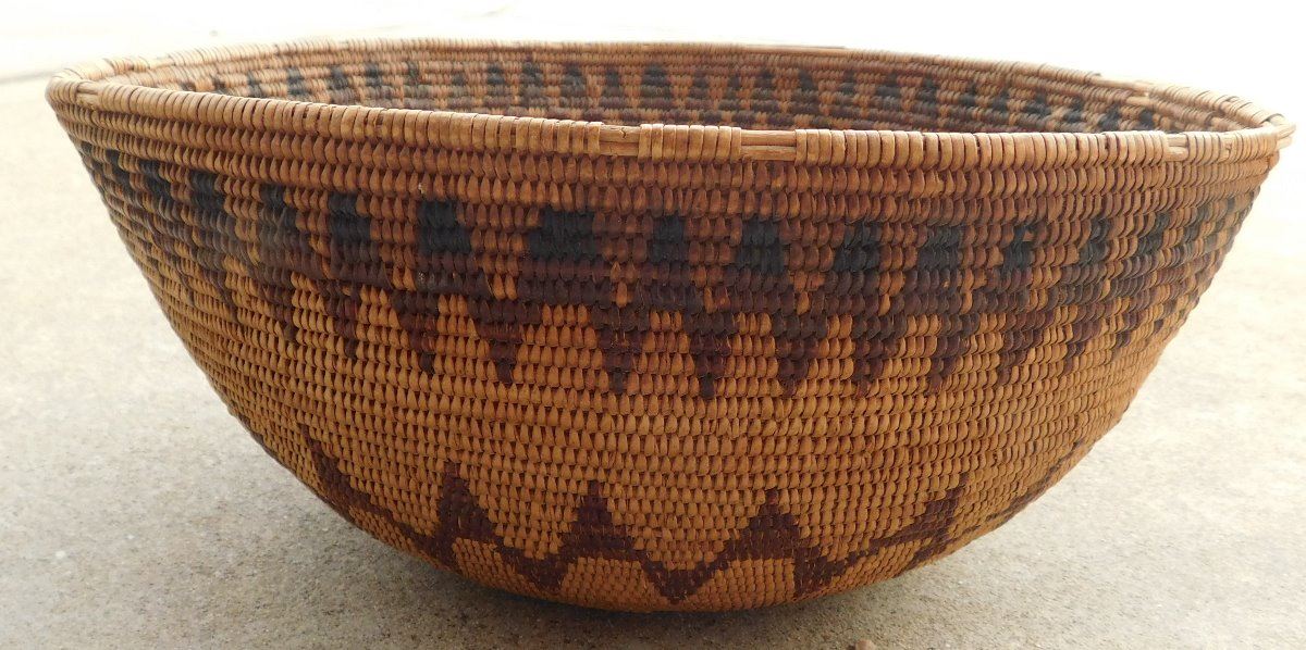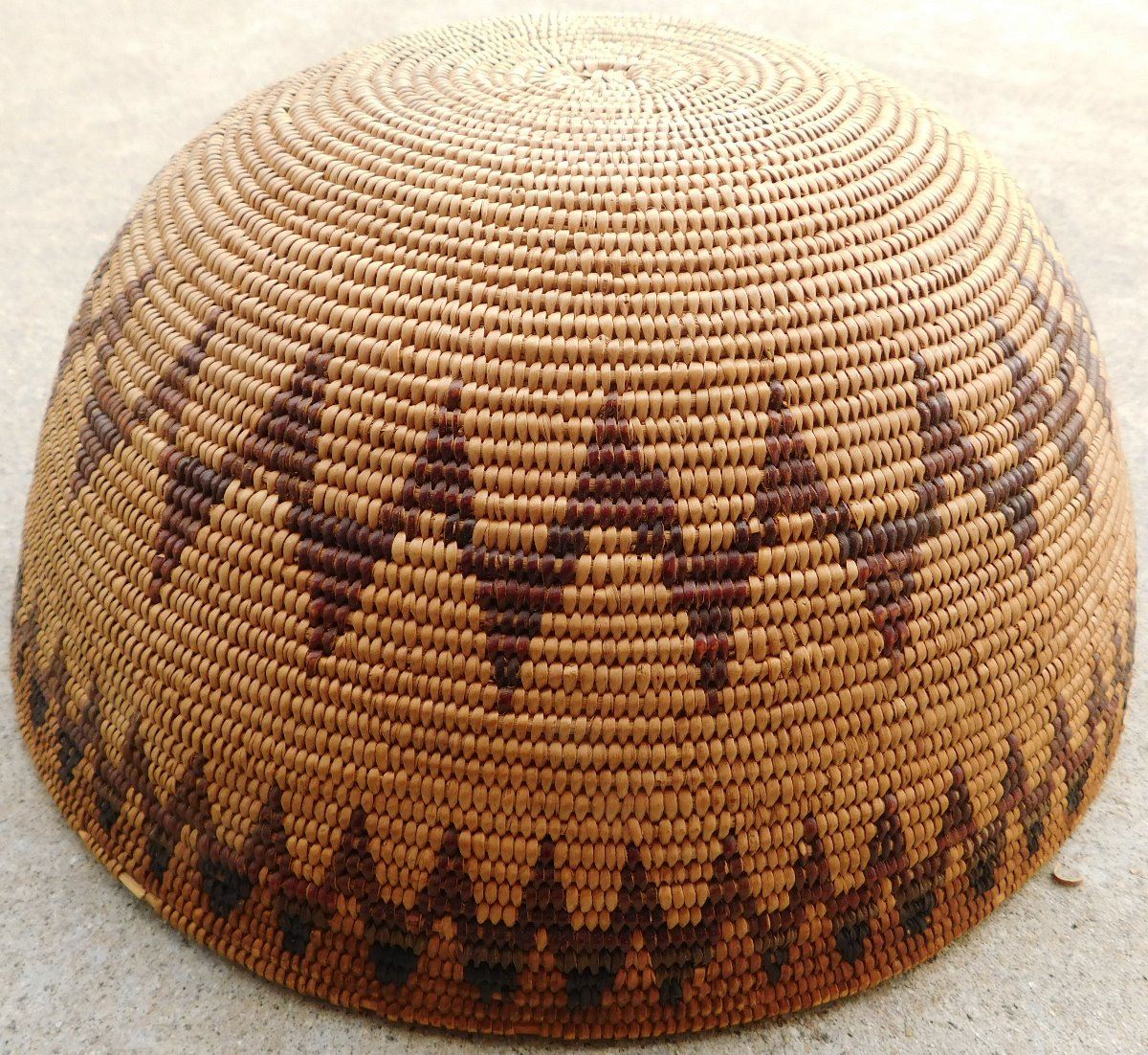 Fine Maidu Basket, circa 1890s. Made of red bud and sumac, the item is 12" x 11.75" x 5.25". Northeastern California. Beautiful design, museum quality basket with good investment value. Condition: Minor rim damage, see images. Shipping: $50.00 w/insurance and signature, double-boxed.