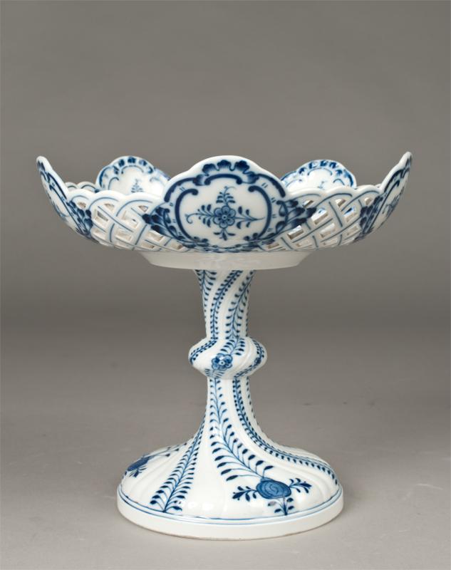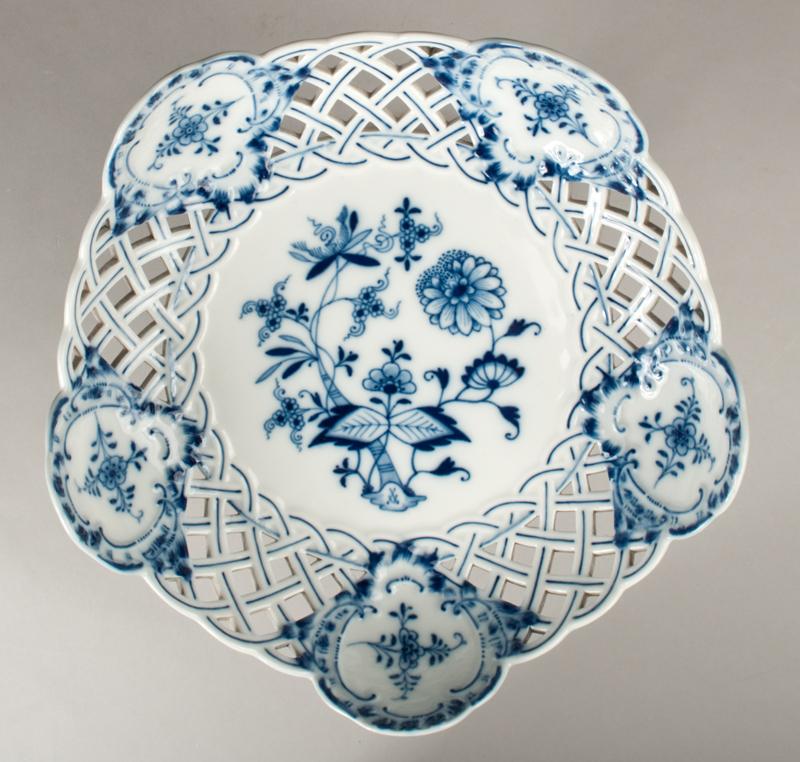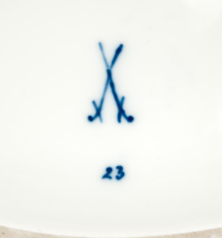 The openwork sides, alternating with five medallions, all painted with floral decoration, crossed swords in underglaze blue, 23 in underglaze blue and impressed 26, 8.5"H x 9"D, circa late 19th century.
