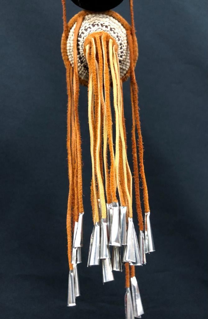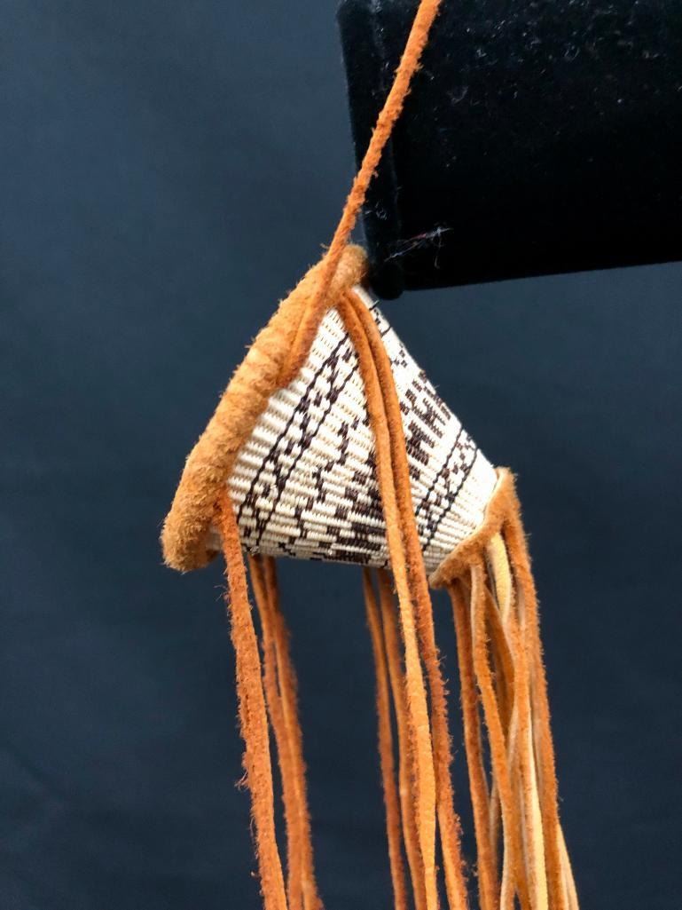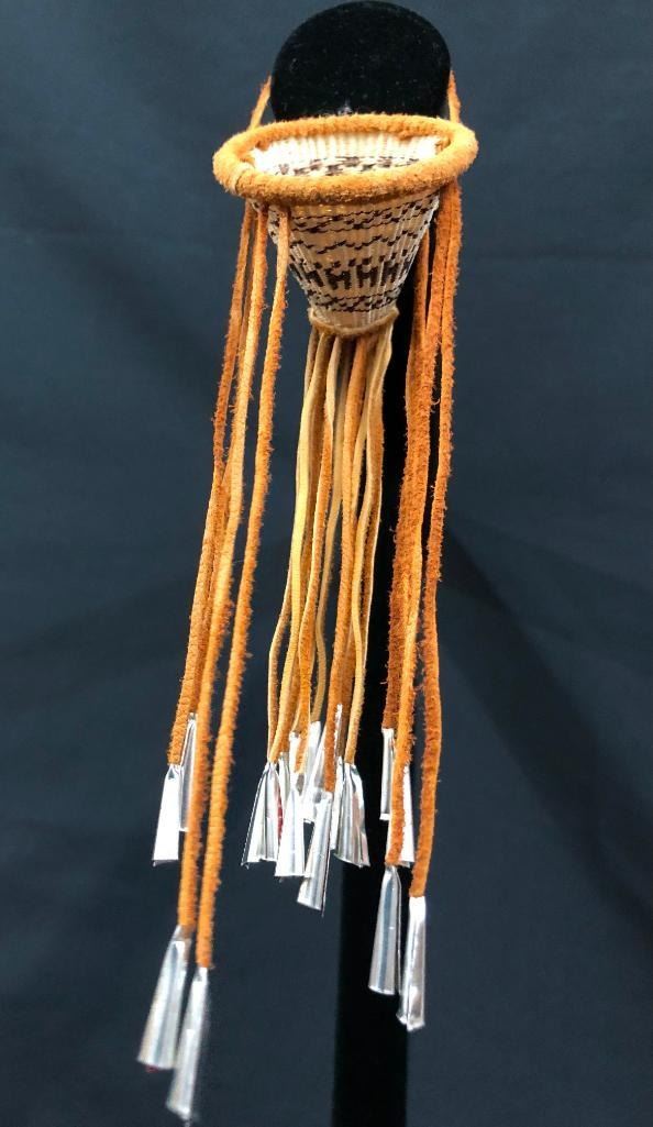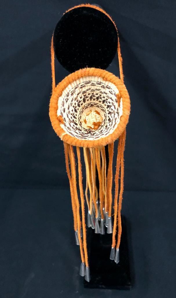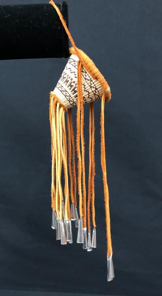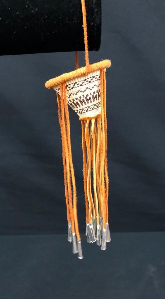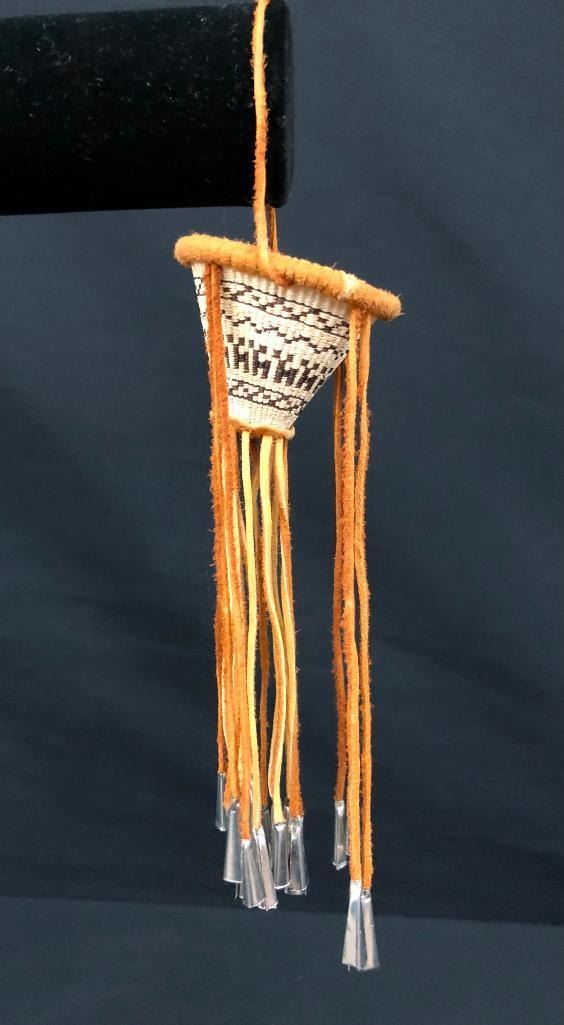 For sale in this lot is a very finely woven, miniature Apache burden basket. It features traditional designs with leather accents and metal jingle cones. This one would be a nice addition to any basket and/or miniature collection! MAKER: Unknown Apache weaver. APPROX AGE: Circa 1970s. SIZE: 2-1/8 inches wide x 6 inches long. CONDITION: Good for its age, normal wear expected. Please look closely at the pictures as they are an important part of our description and are hereby incorporated into the description, specifically with regards to condition. SHIPPING: There will be a $5 handling / packaging fee for shipping this lot. The actual cost of postage will be added on top of that. BUY IT NOW: If you would like to buy this item now, without waiting for the auction day to bid on it, we do offer this option (which is available up to 48 hours before the actual auction starts). The “Buy it Now†price is the high estimate of this lot (plus applicable fees and the Buyer's premium is discounted to 10% when using the Buy it Now option). If you would like to exercise this option, you must contact us by email (or phone as long as you talk to someone live). Reference this lot number and your intention to "Buy it Now."