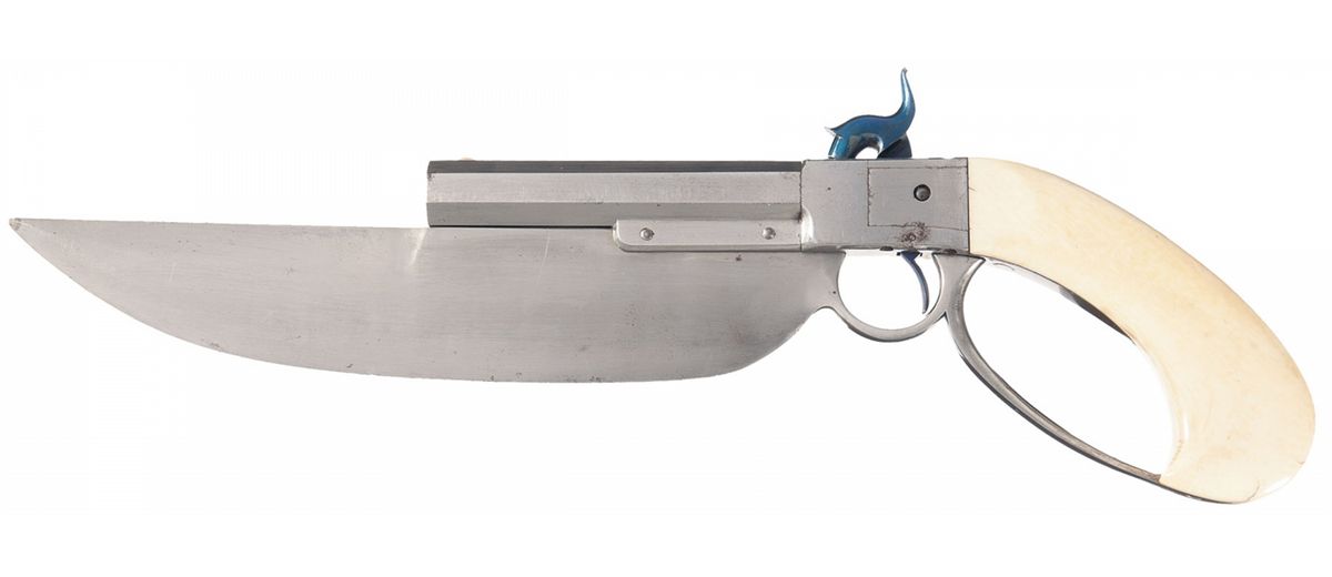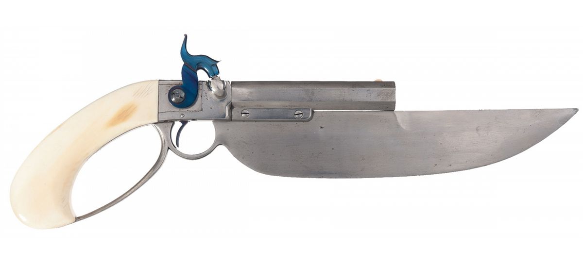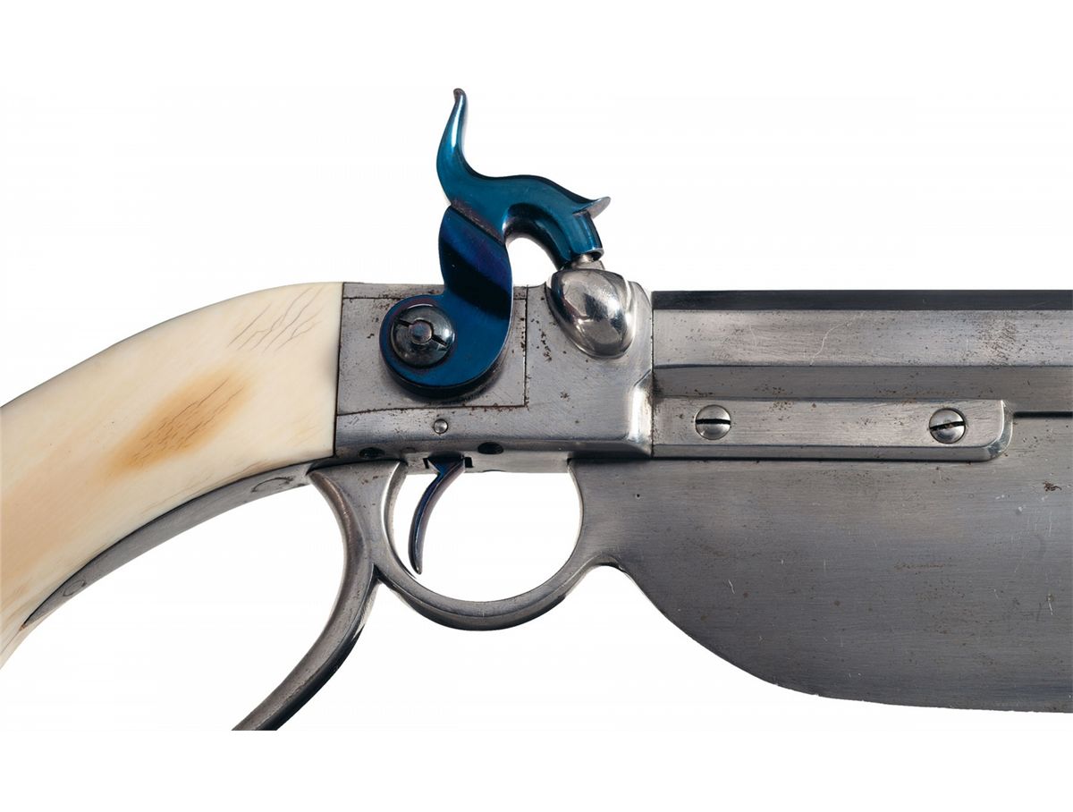 This miniature version of Elgin's U.S. Navy Contract pistol is just over half the size. Except for the knuckle guard extending from the trigger guard to the tip of the butt it is the same as the pocket version of the Elgin pistol as made by C. B. Allen which was also in the Locke collection. This pistol is completely unmarked and has a 7 1/4 inch blade. Other than size there is only one variation from the contract pistol, the lack of a dovetail joint between the blade and the front edge of the barrel, needed to give more support to the blade on the larger size. The pocket size does not have the dovetail. According to Locke, this was obtained directly from the Allen family but no documentation was found. Pictured Locke, p. 472 Provenance William Locke and Frank Sellers, 1973
